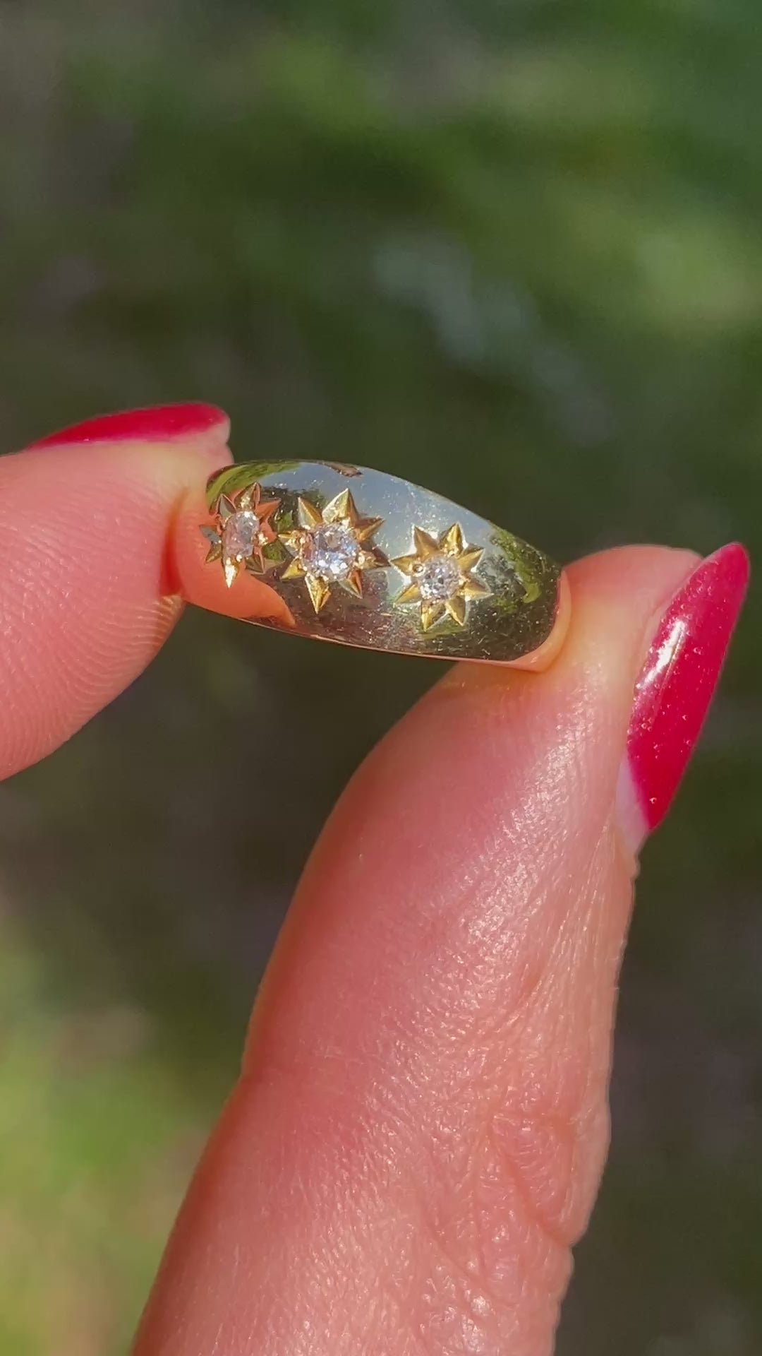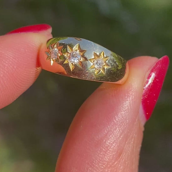 Comprising 3 lively old cut diamonds in crisp starburst shaped settings, this ring is durable and robust, a perfect ring for everyday wear. It would also make a wonderful engagement ring.