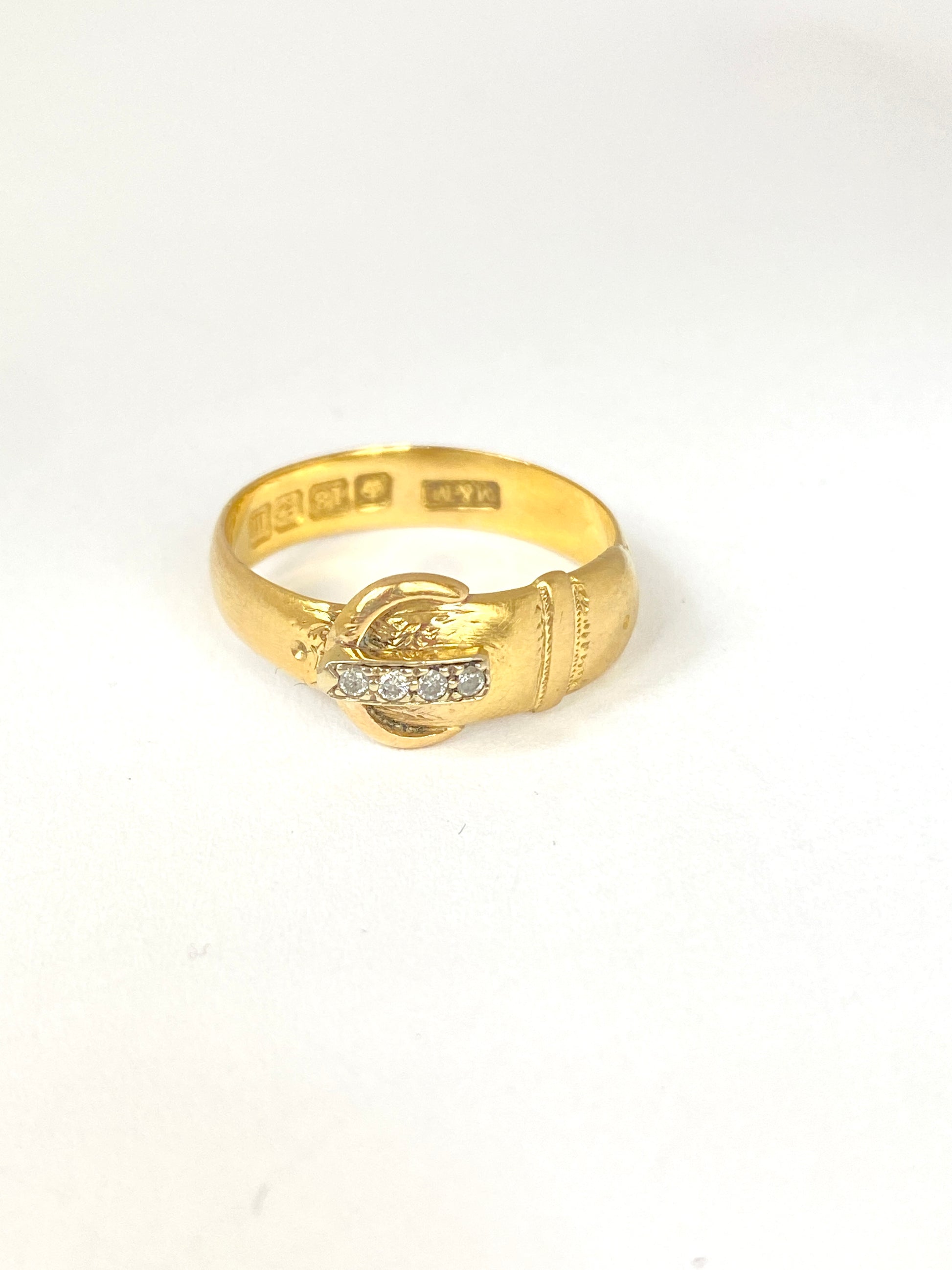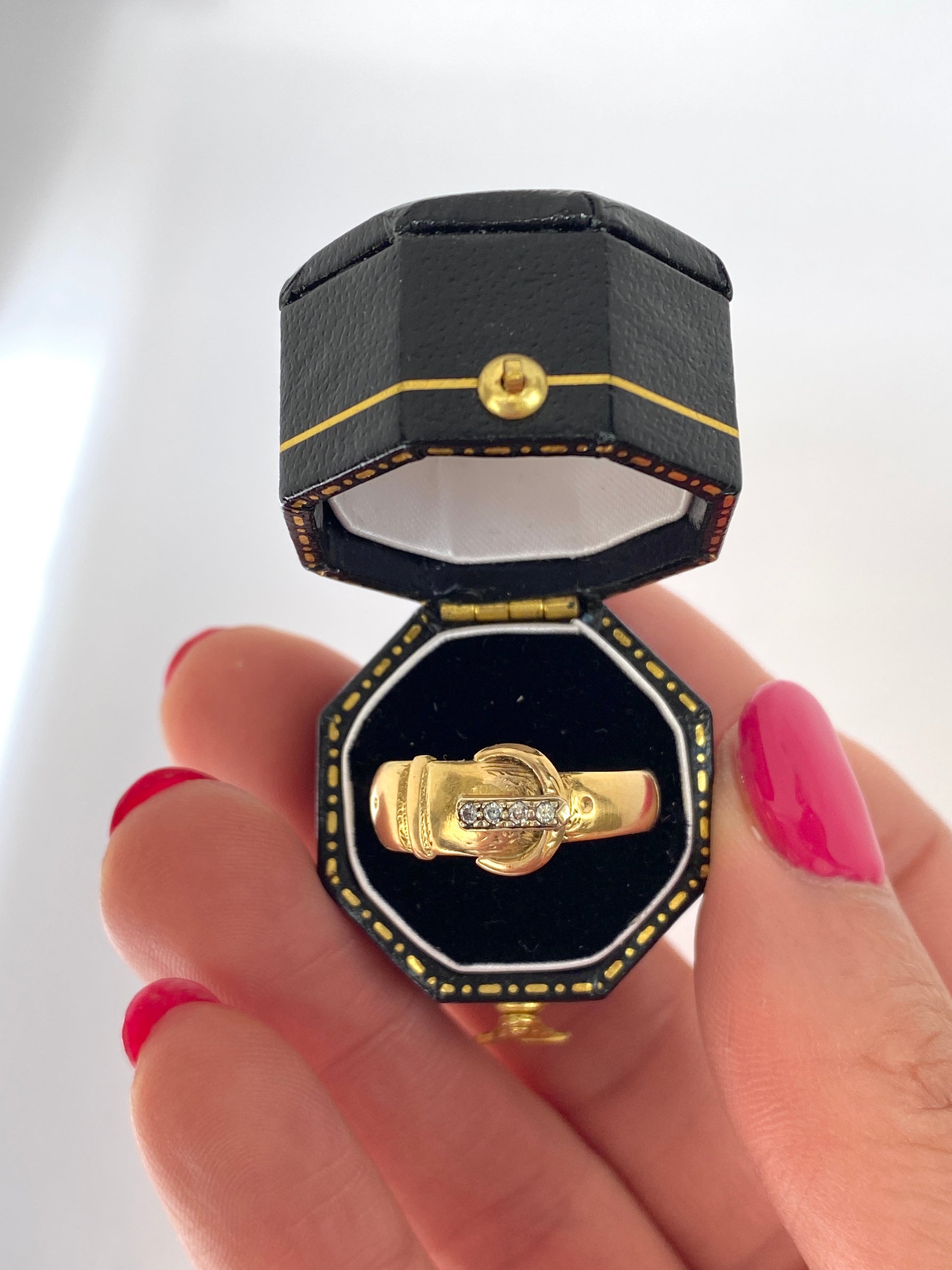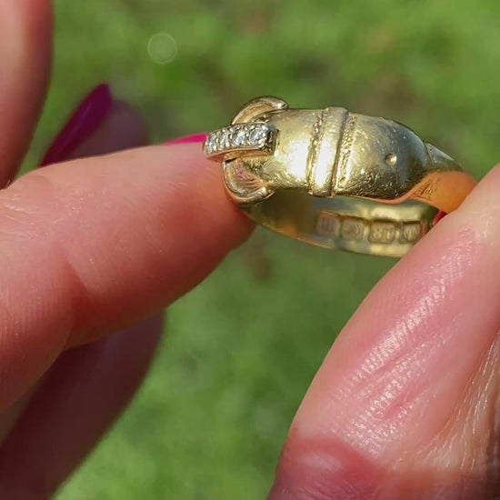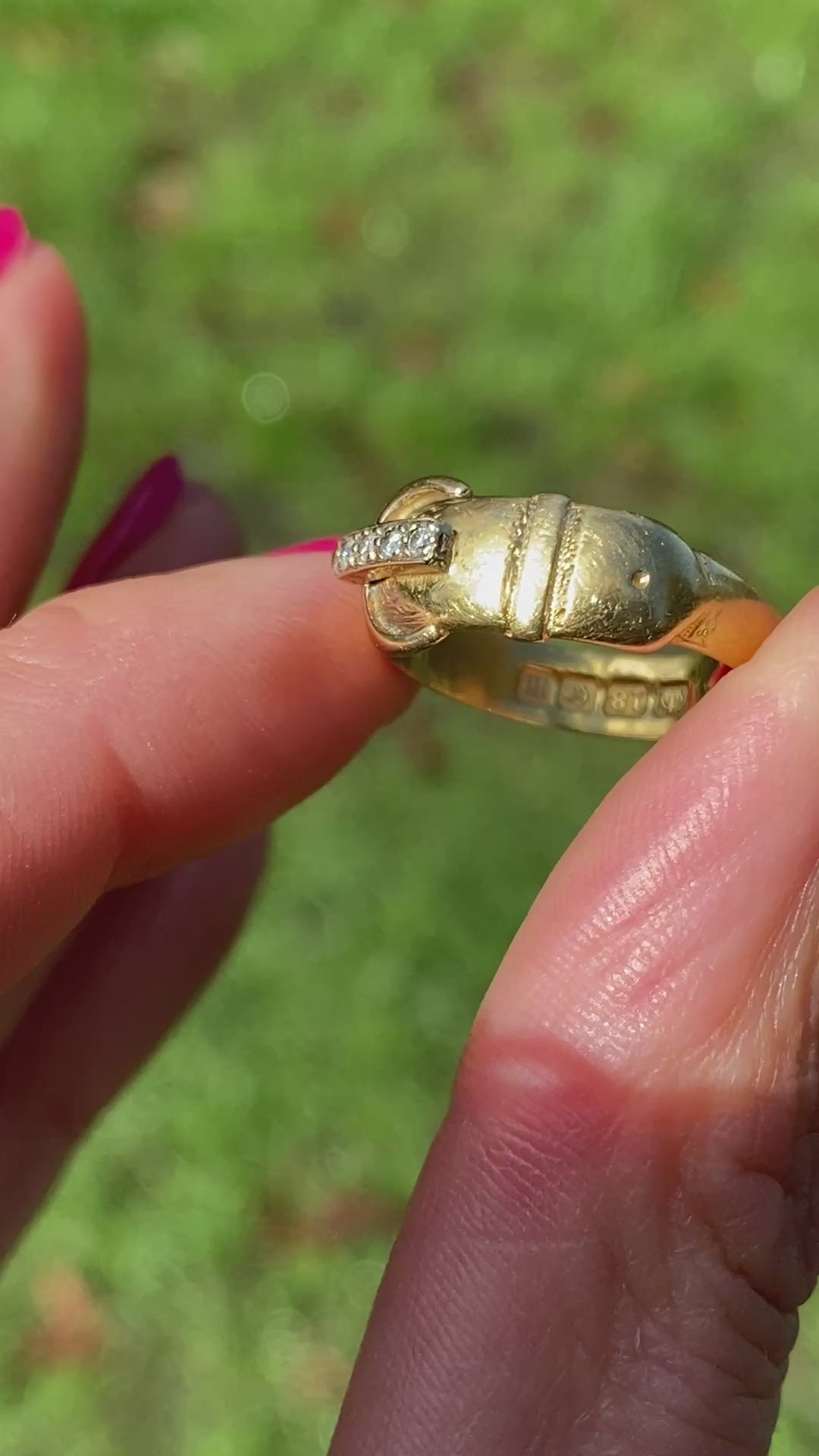 This is an incredible and quite unique antique buckle ring, fully hallmarked for 18ct Gold, Birmingham and the year, 1911.