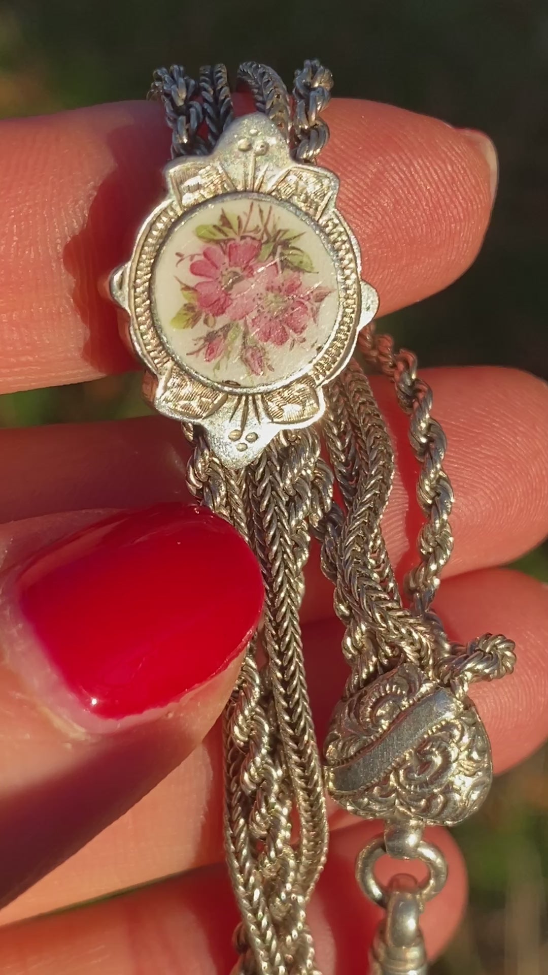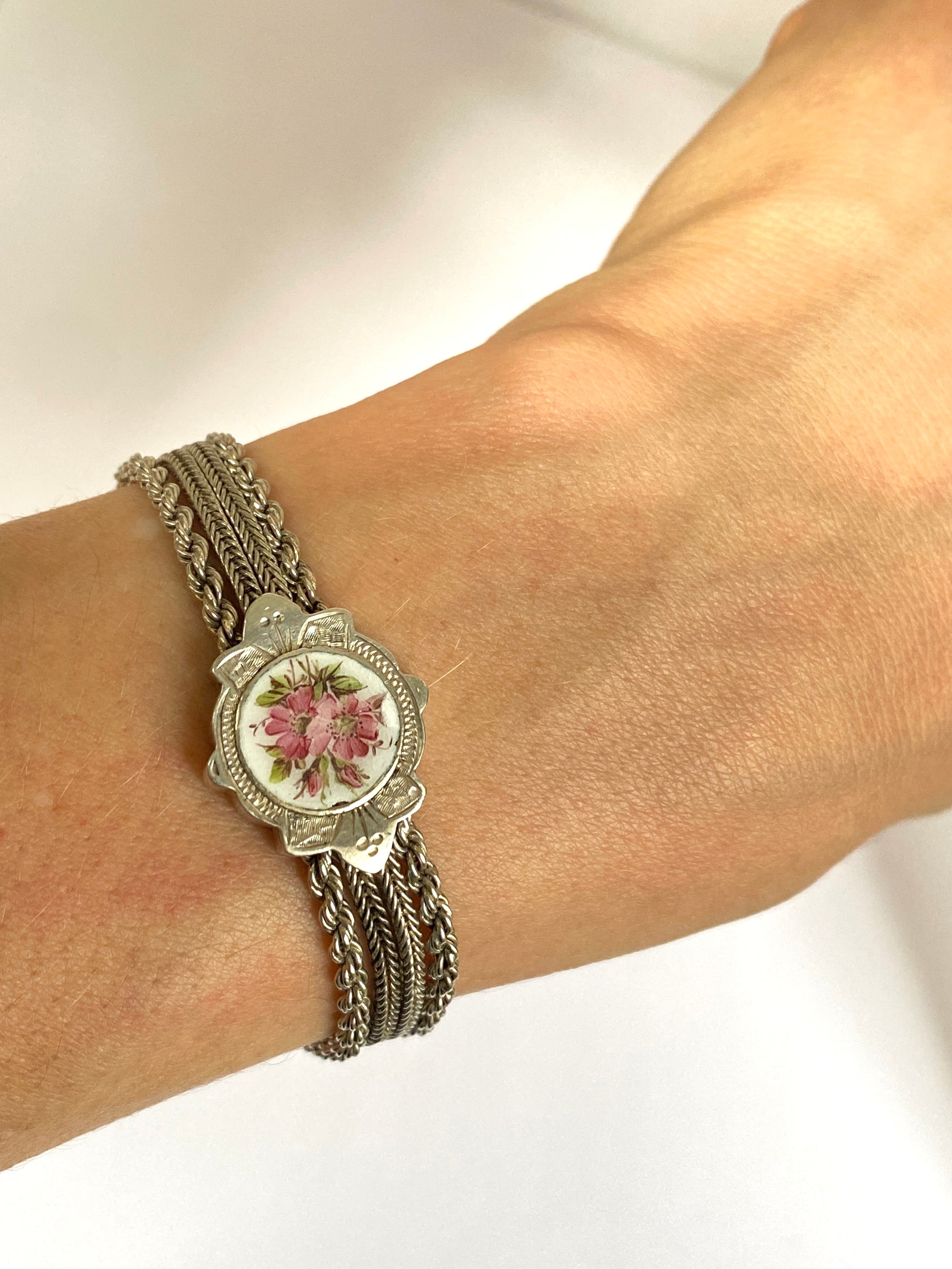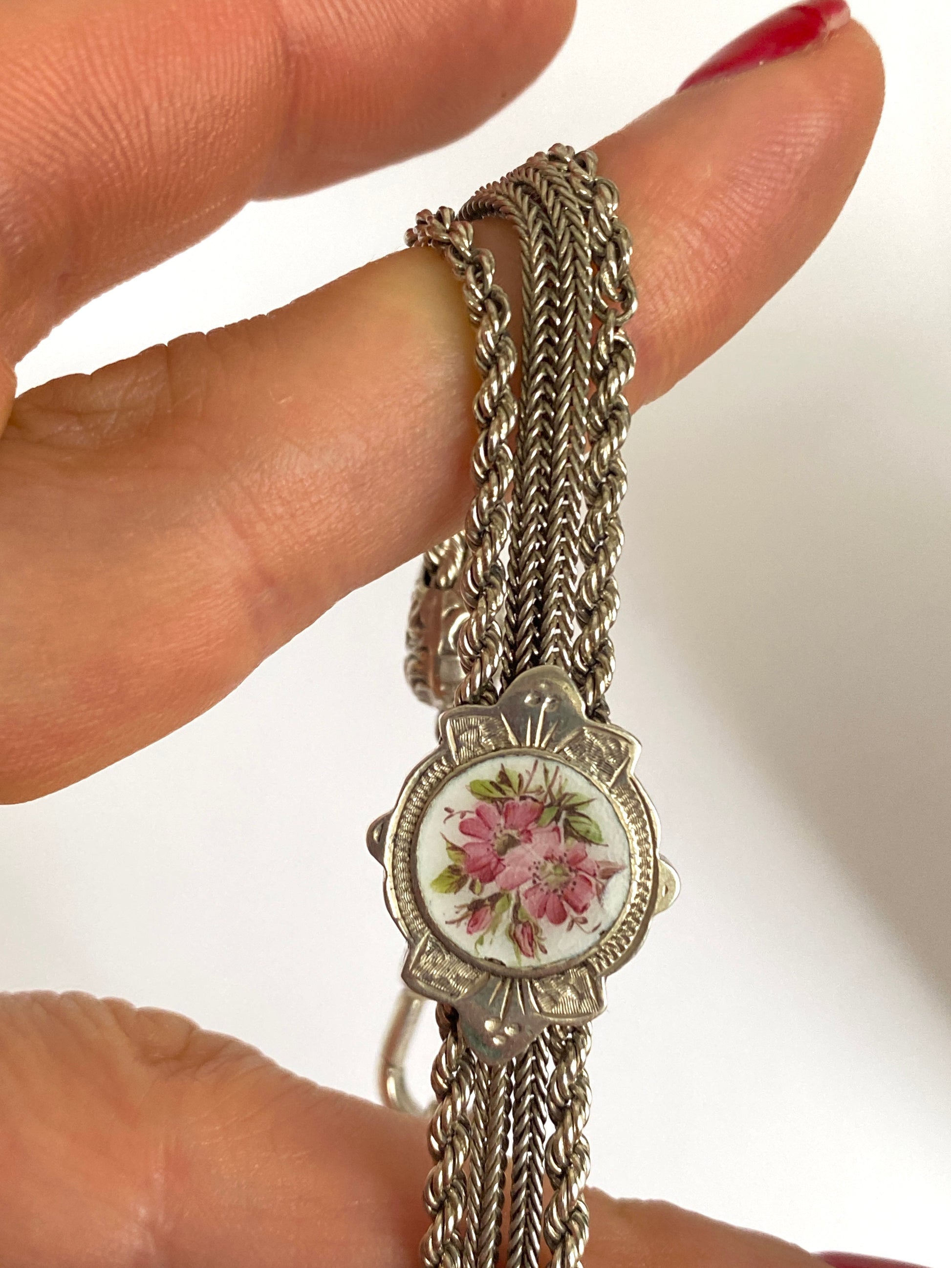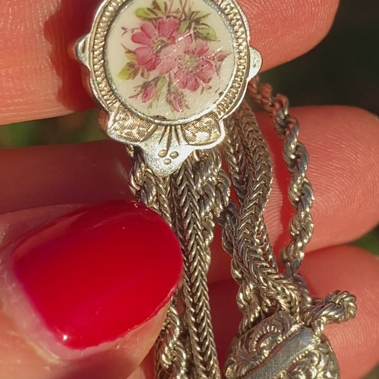 This is a magnificently crafted hand made antique Albertina bracelet. With a stunning and unusual enamel slider featuring a beautiful Rosa Canina flower, fancy twisty rope links, two silver heart stoppers, a dog clip and a fabulous decorated tassel, this unique albertina has it all!