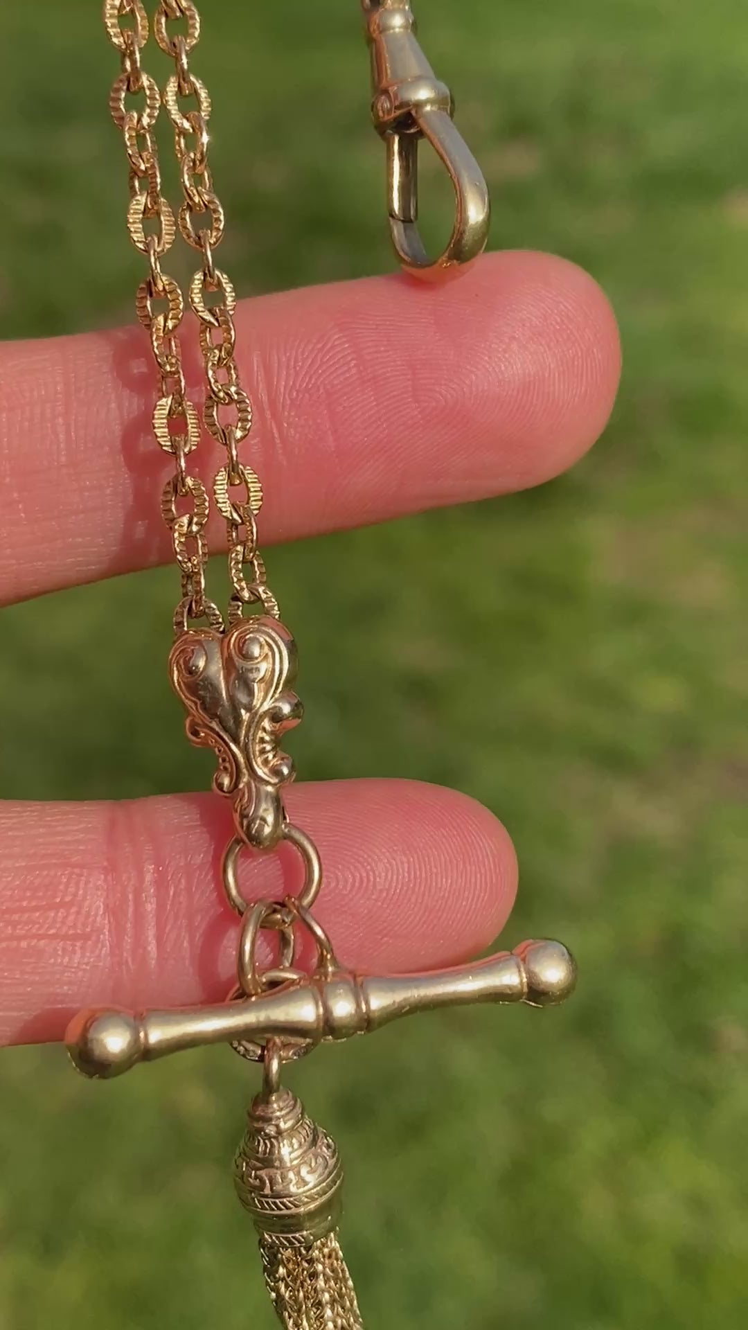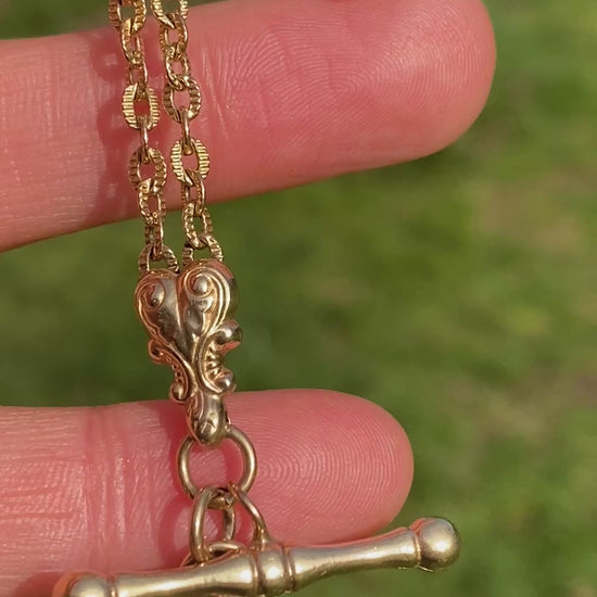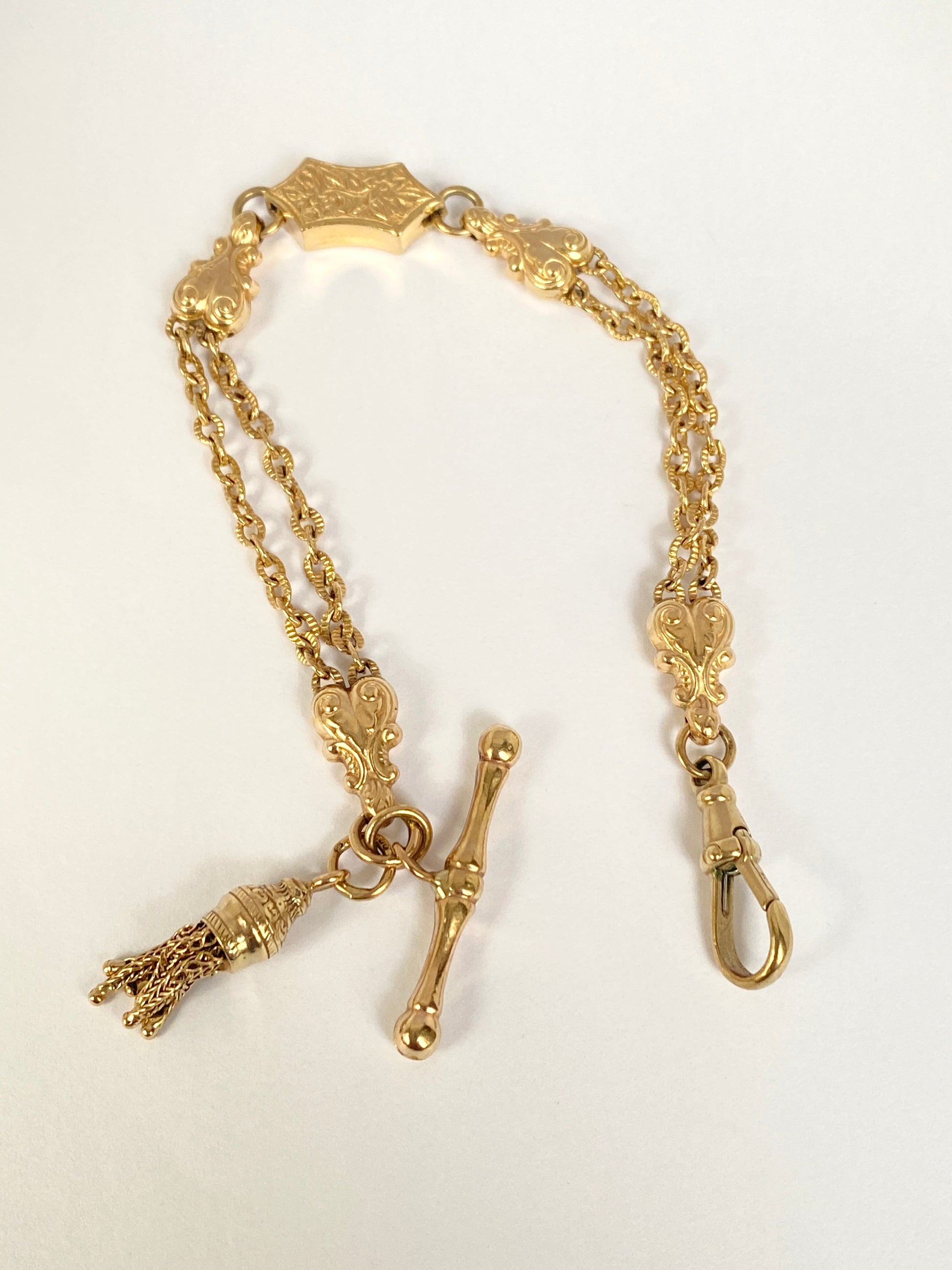 This is a magnificently crafted antique Albertina bracelet.  Featuring a dog clip, fancy T bar, tassel charm, a double chain link and beautifully crafted spacers, this one has it all!