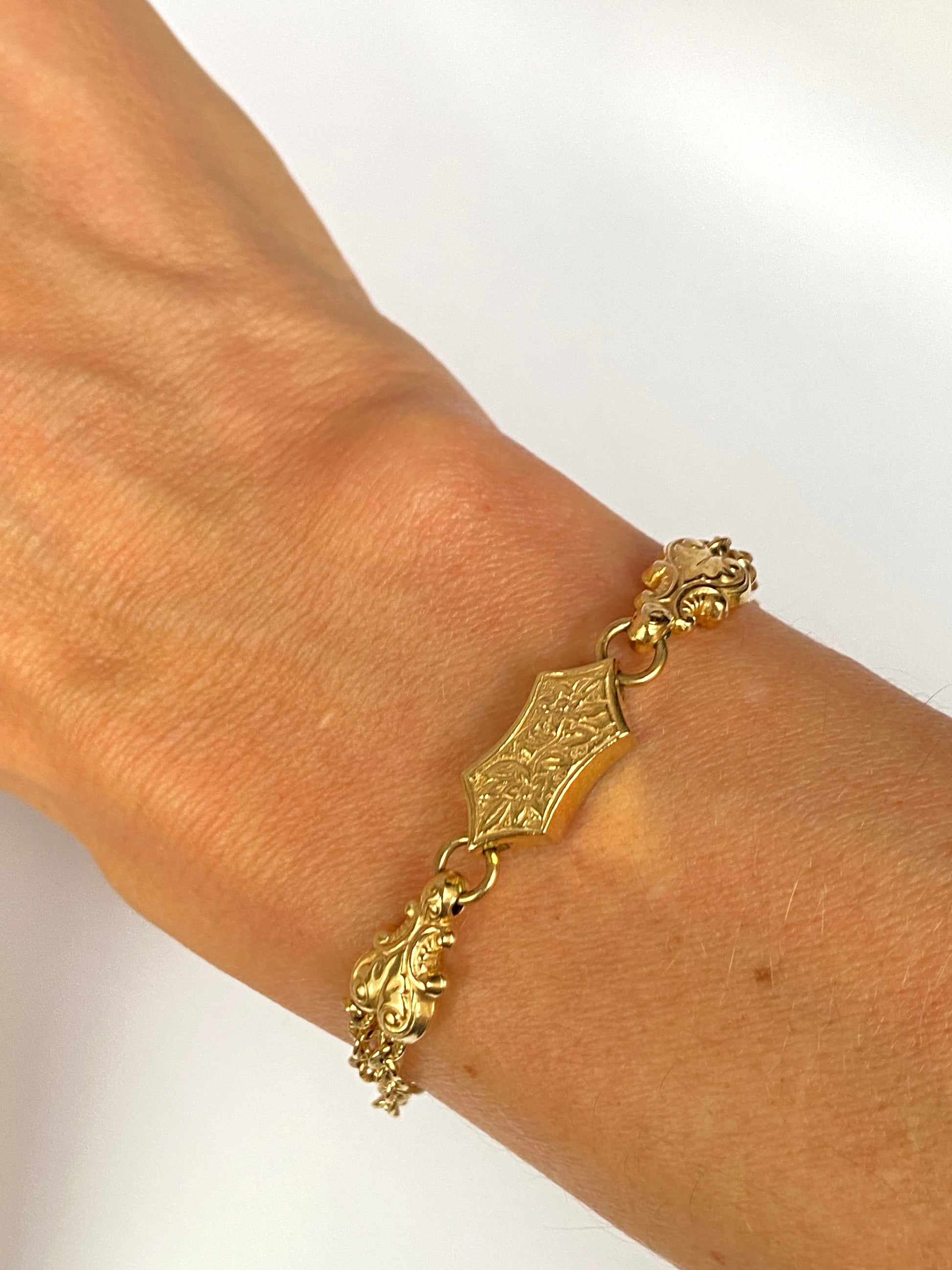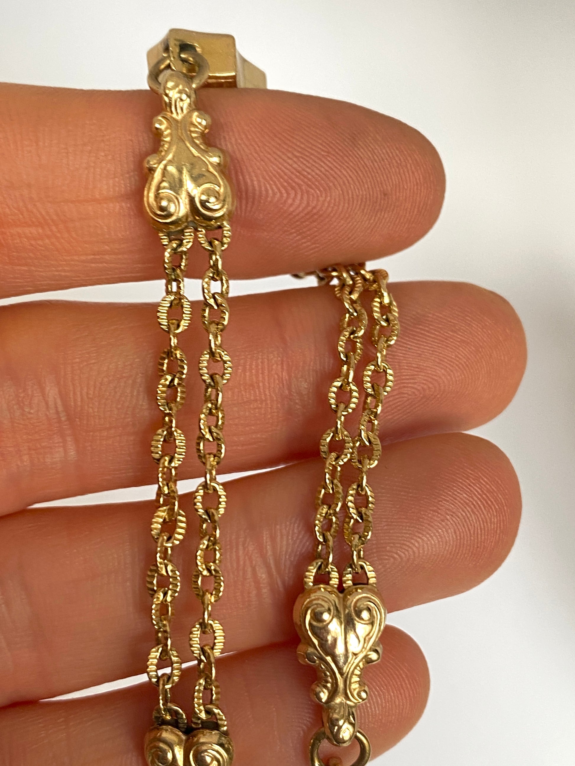 Albertina's were originally used by ladies to connect their pocket watch to their dress. They were very common in Victorian times, but nowadays they are worn as bracelets.  As was the way with antique, hand made items, these Albertinas were not mass produced and were created by the goldsmith for the wearer, with little additions like charms and hearts, and different links, making many of them completely unique.   In my view, this is what makes them so special.