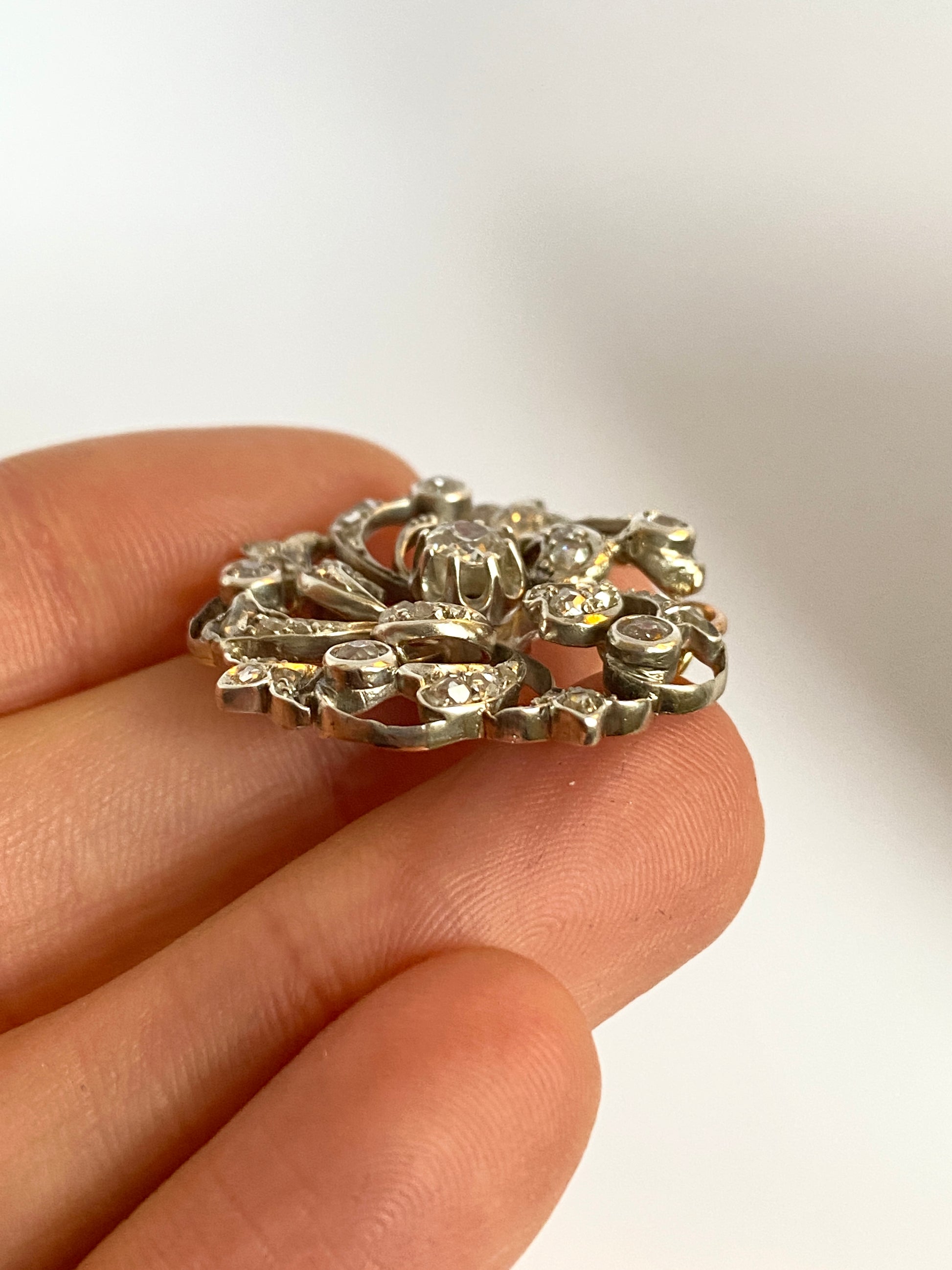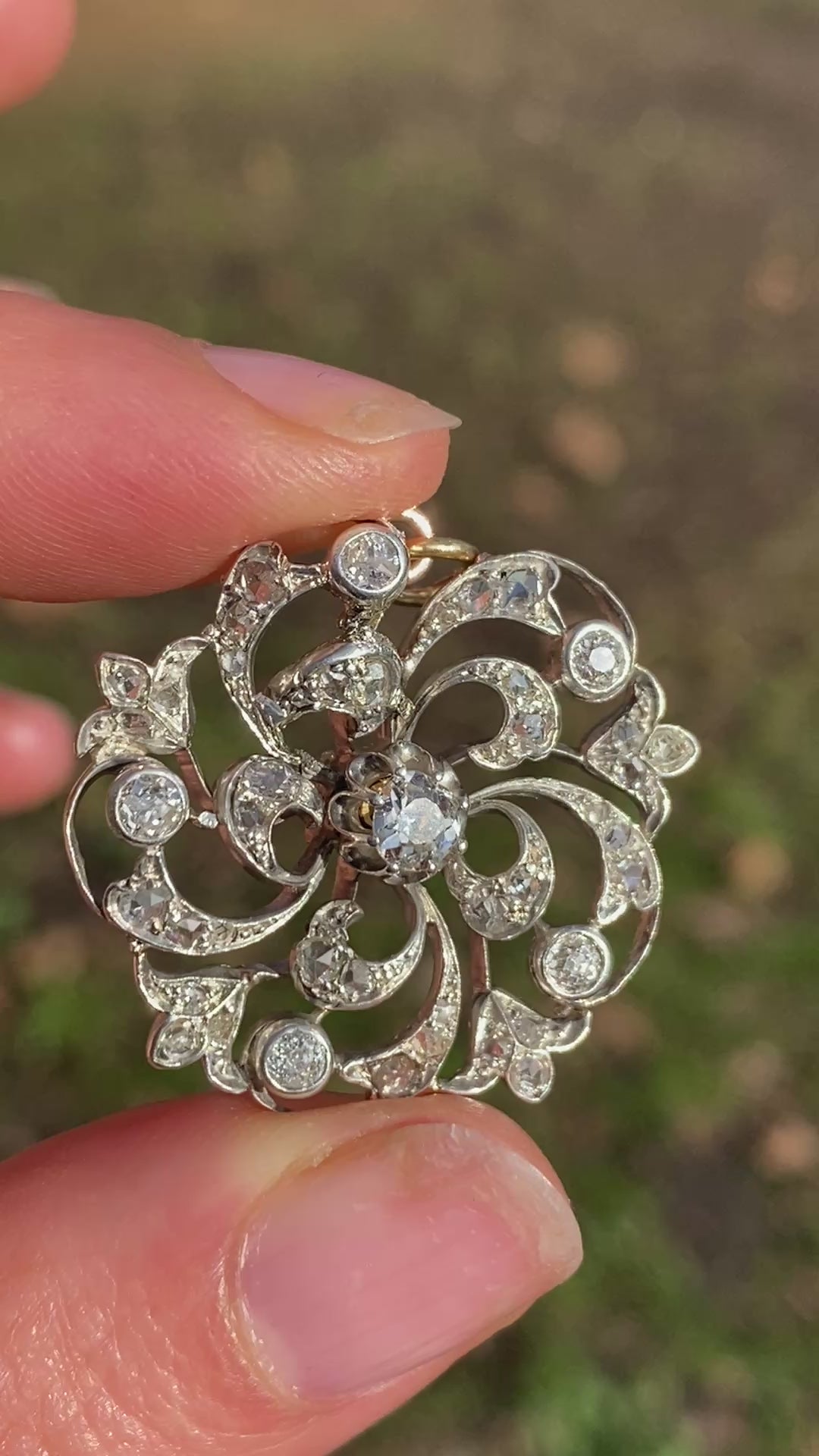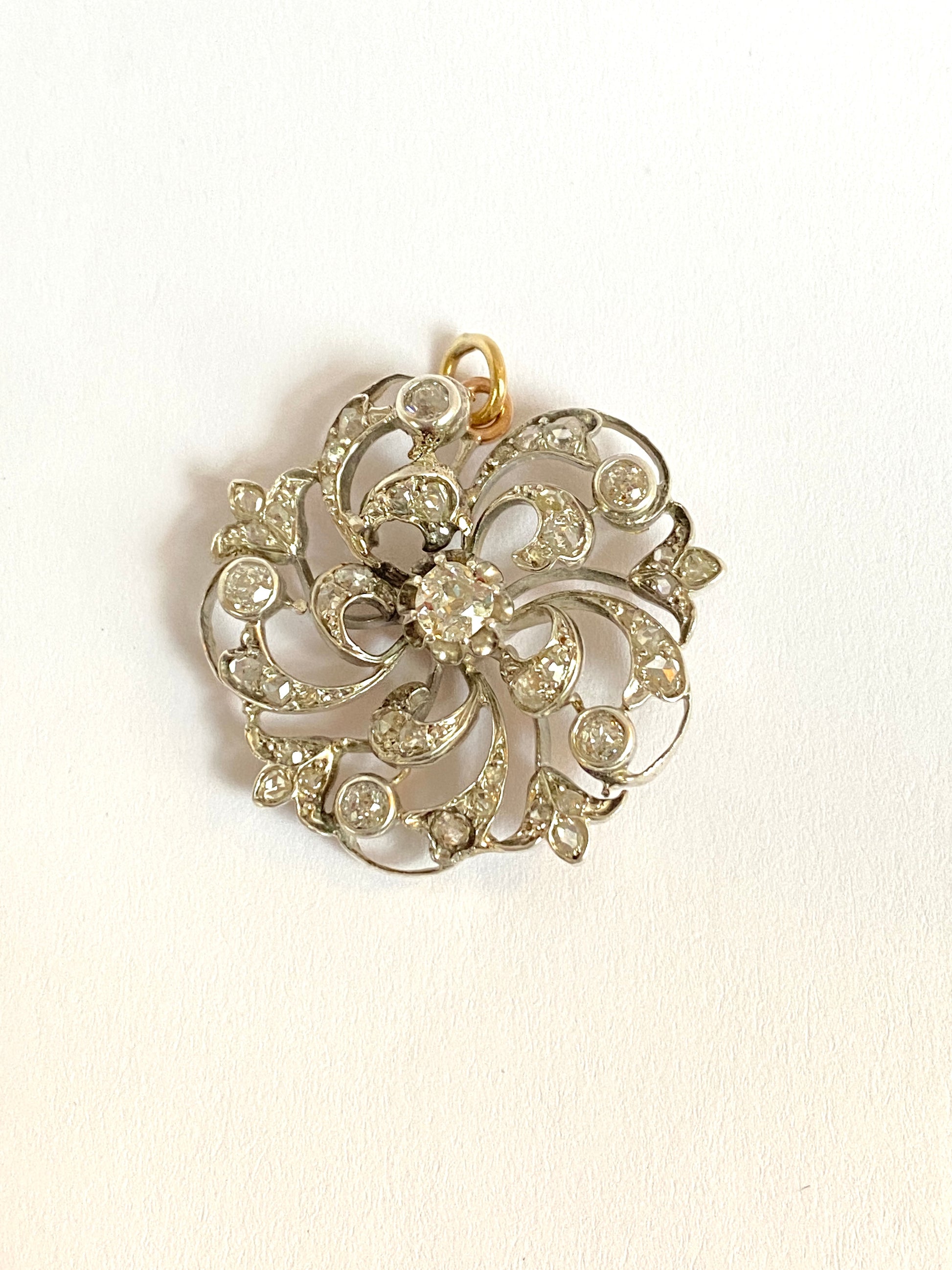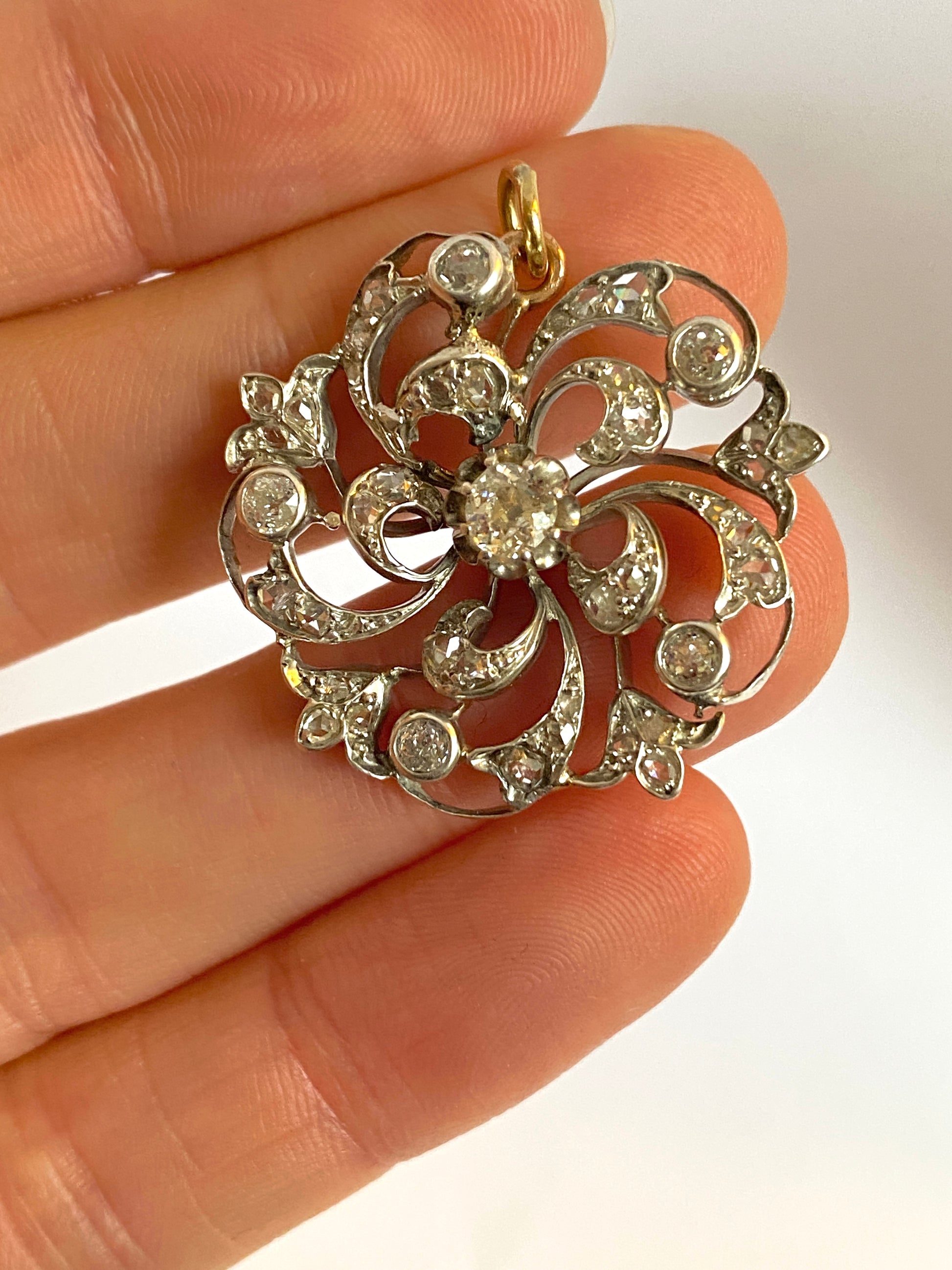 This antique pendant is in fabulous condition with the mixed cut diamonds all well set in either bezels or claws. It weighs a healthy 7.29g. I think this peice may have originally been a brooch, but it has been tastefully converted to a more wearbale pendant with a 9ct gold bale.