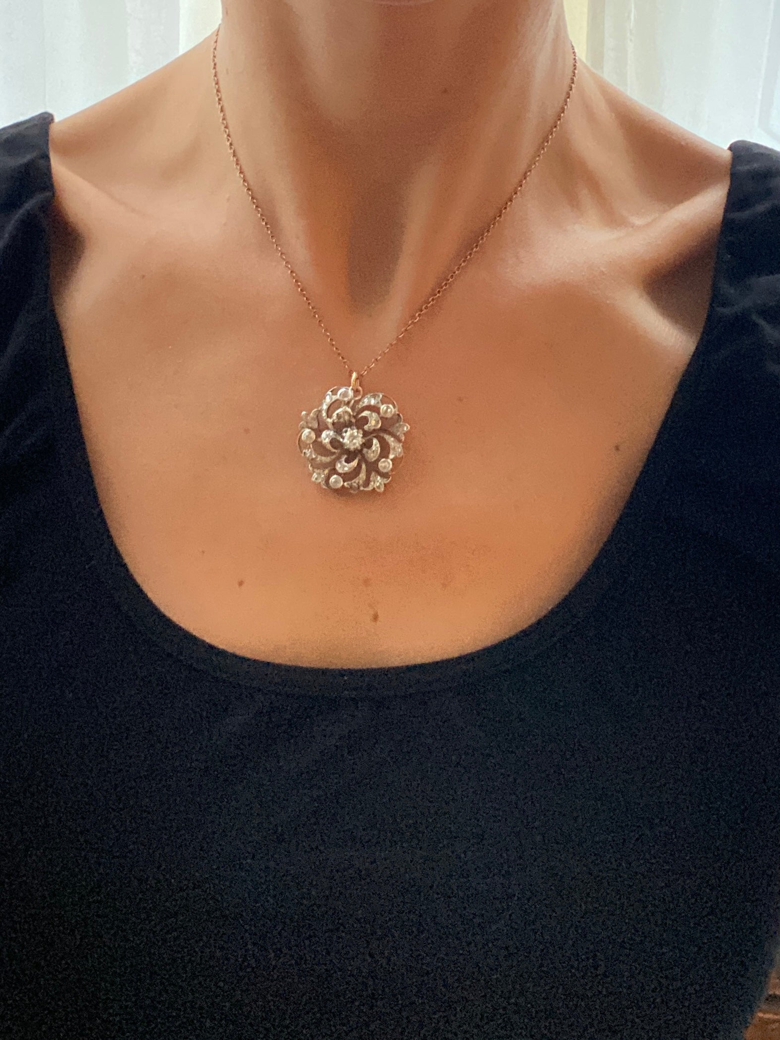 This is such a stunning pendant. Crafted in Platinum with a 9ct gold back, its beautiful floral design is a great size at 3cm diameter. There is a wonderful flow to this pendant; its circular shape is made up of 'leaves' and 'petals' which shimmer with their encrusted diamonds as it moves.