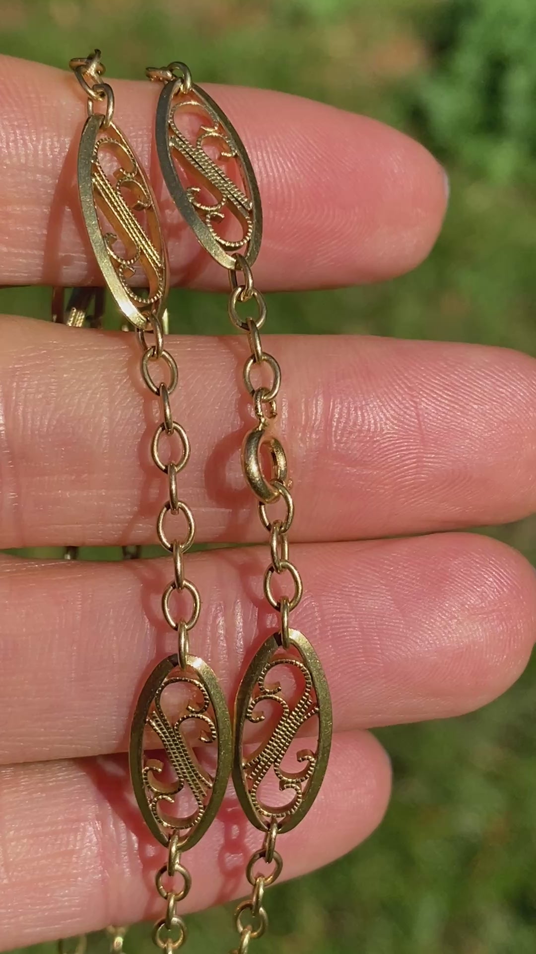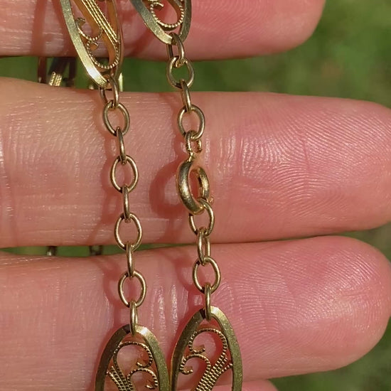 This superb fancy link chain dates to the early 20th Century and features timeless filigree links (comprising flat oval shapes, pierced to display an ornate filigree design at its centre). These fancy links are connected by stretches of belcher links.