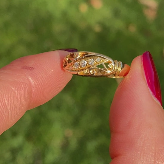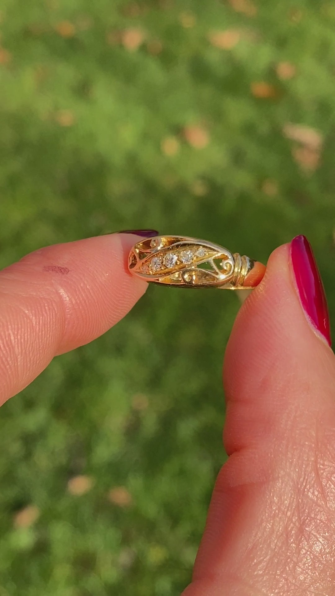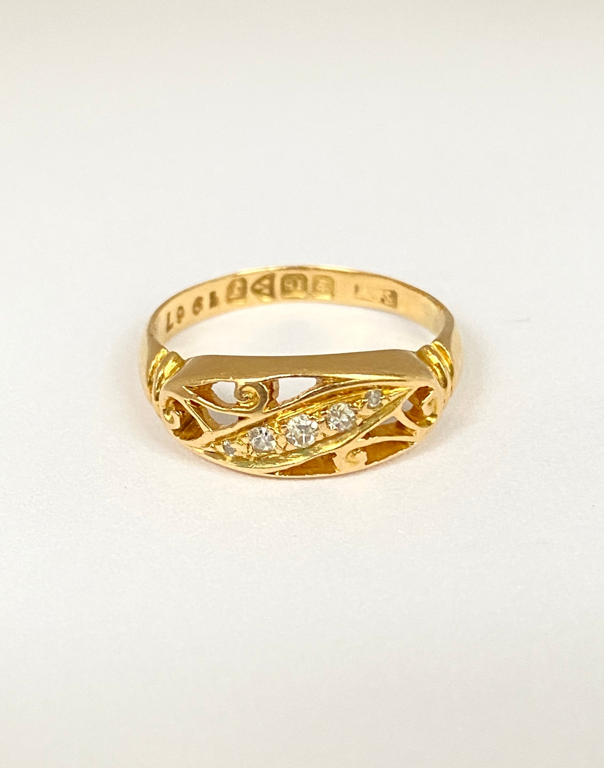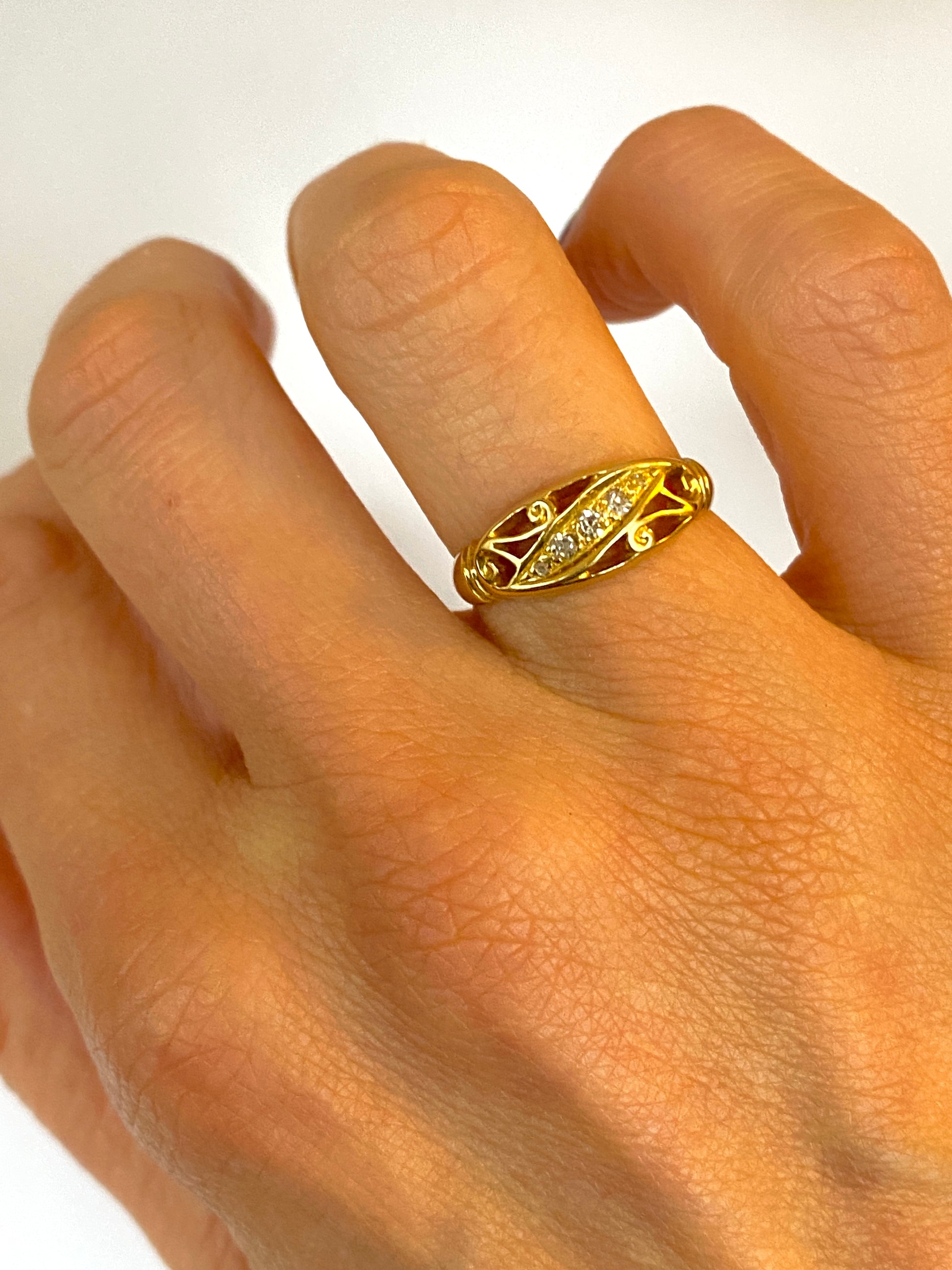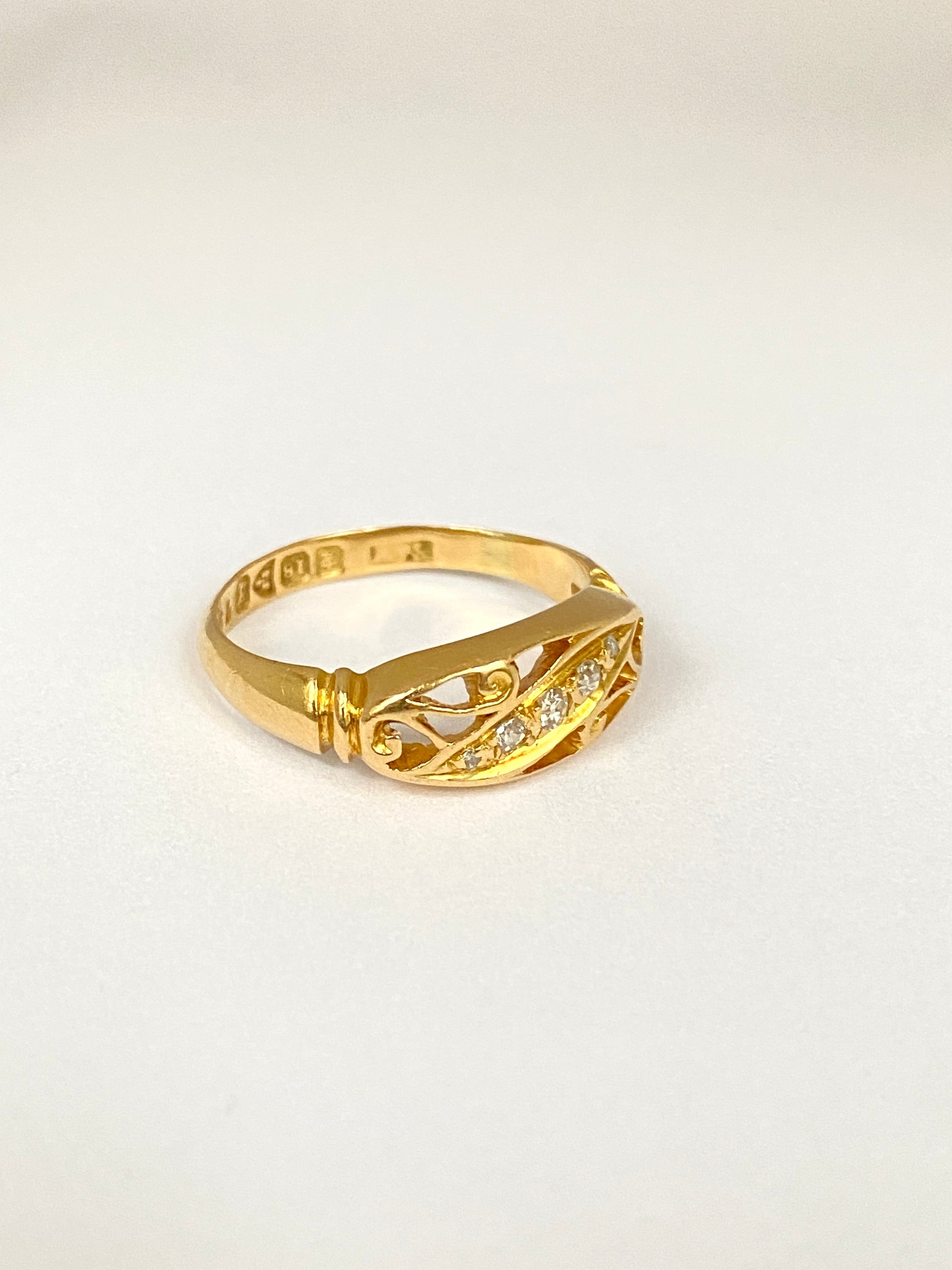 This is such a pretty ring. Set on an 18ct gold band, it features 5 old cut diamonds arranged in a diagonal design across the gallery. Beautiful filigree gold work surrounds the gemstones, giving the ring a really unique feel.