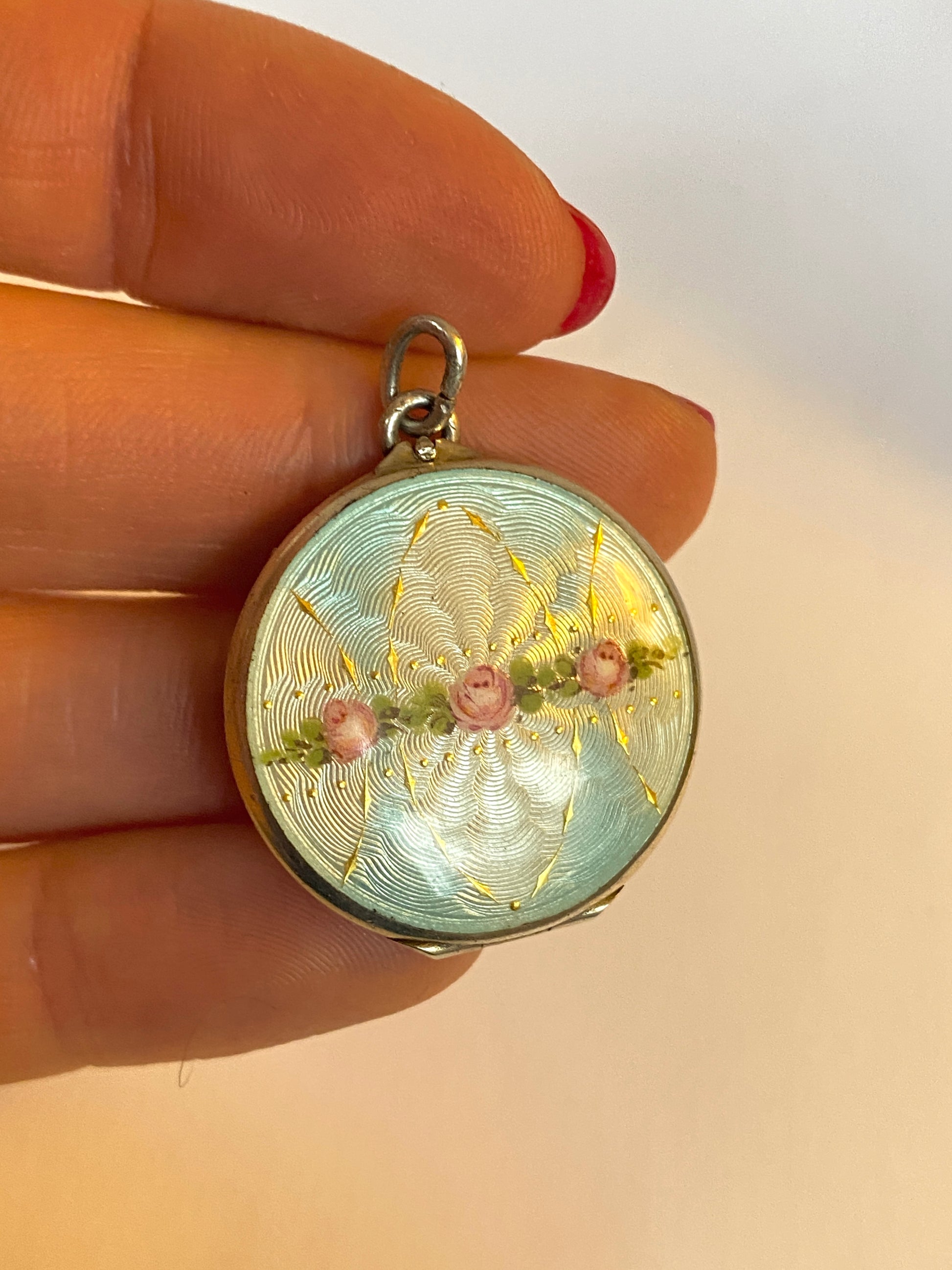 This is such a pretty Sterling Silver Locket with Guiloche Enamel decoration. Dating to the Art Nouveau era, it features the beautiful guilloche enamelling of three pink roses on a sky blue background with gold detailing