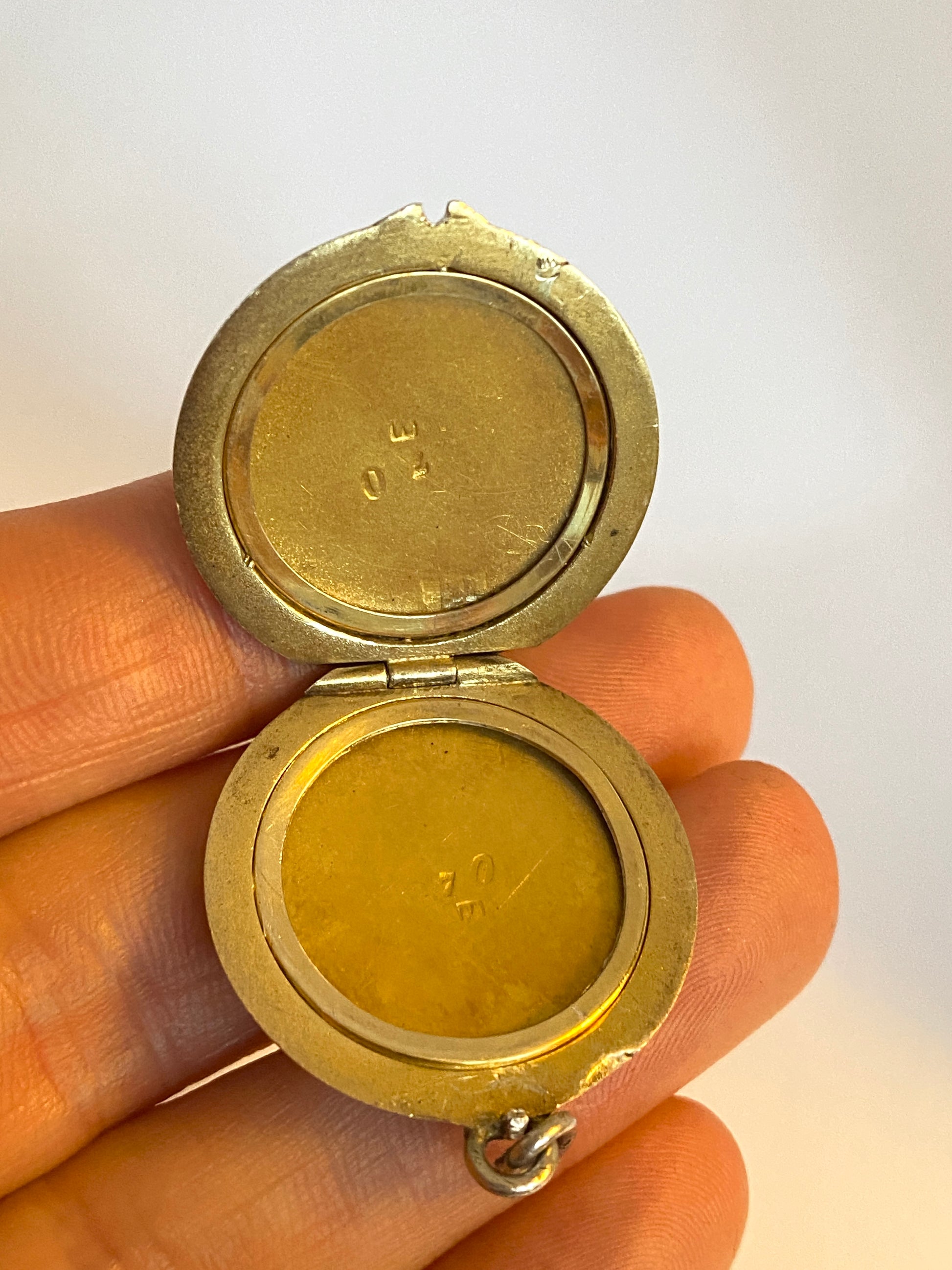 The locket. which remains in excellent condition, contains its original frames and covers so that pictures can be added straight away. It can also be worn empty, just as a beautiful pendant.  It has a diameter of 2.7cm and a weight of 12.14g