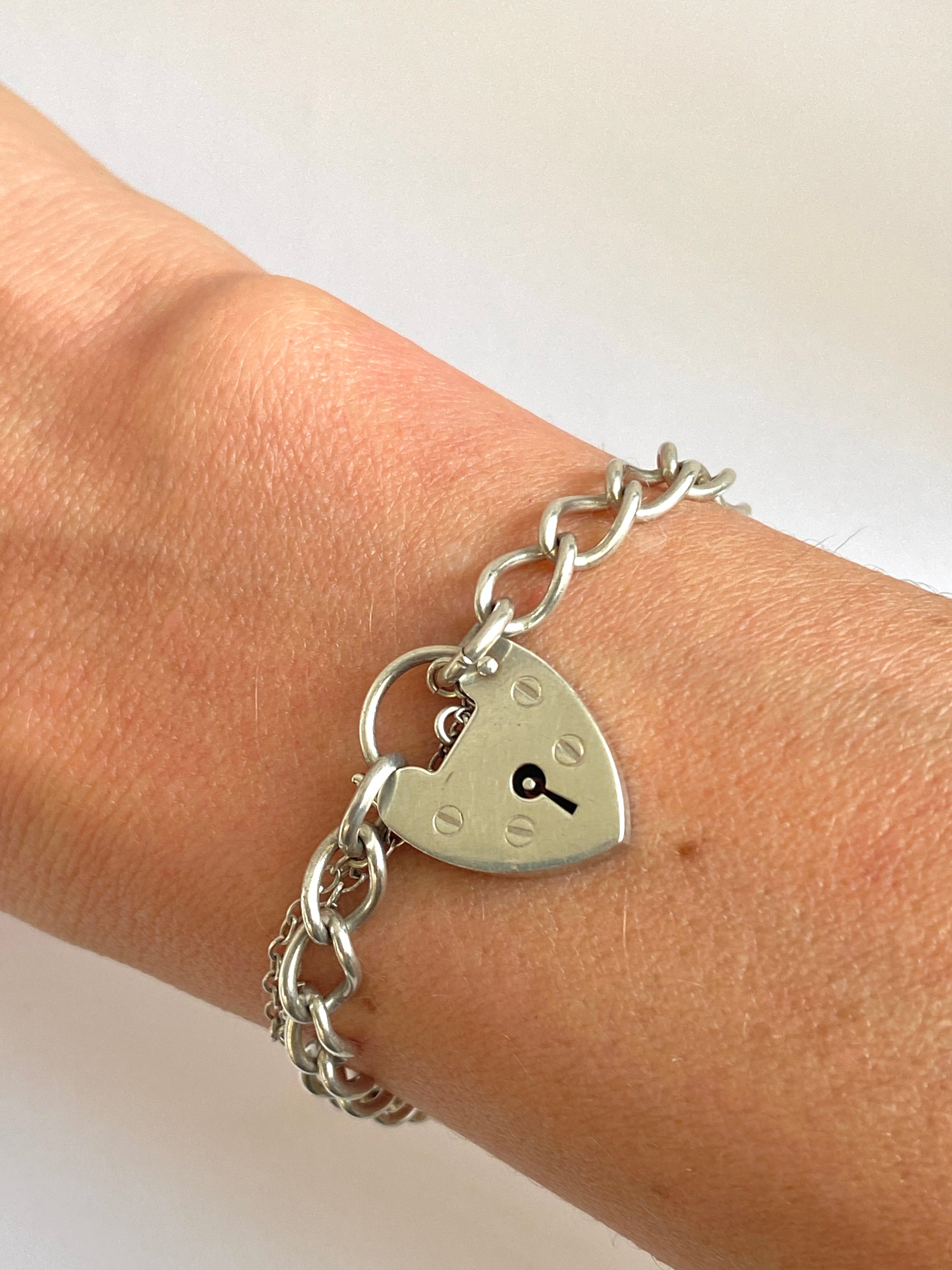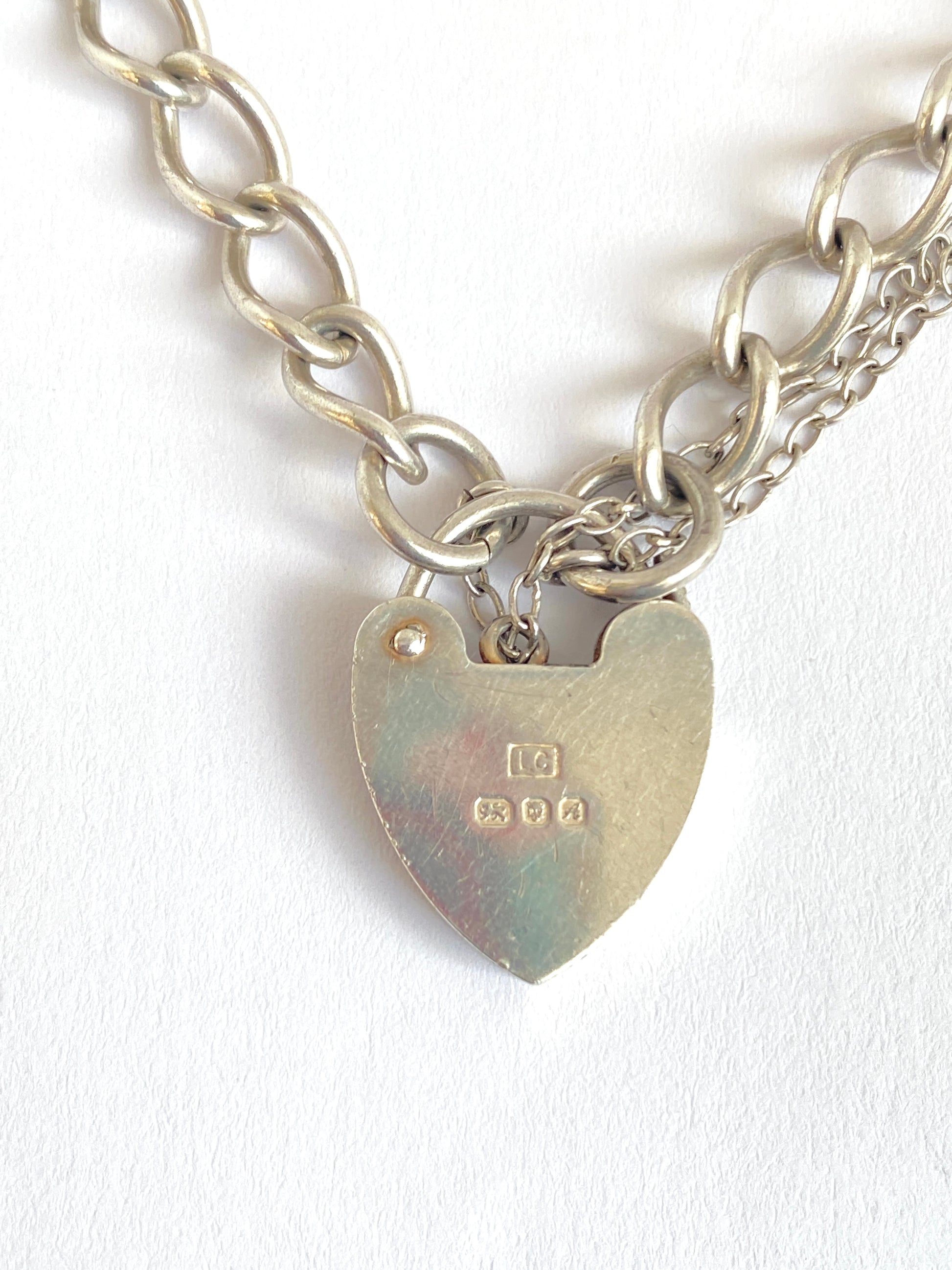 Hallmarked, Vintage Solid Silver Curb Link Bracelet with Heart Padlock, 1975