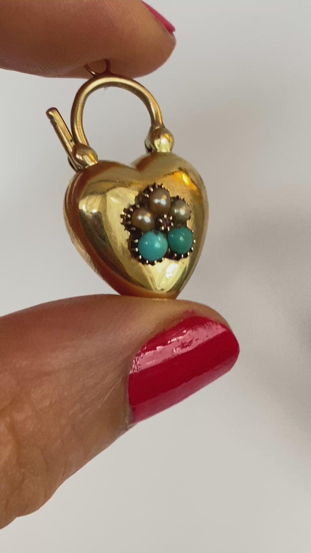 Set in 15ct gold, this rare and substantial antique padlock pendant is in full working order and opens and snaps shut nicely. It is decorated with Peals, Turquoise and a central ruby, emmulating a forget me not flower.