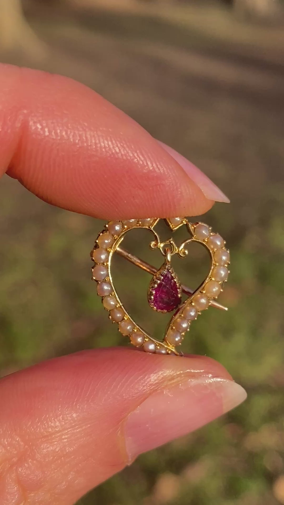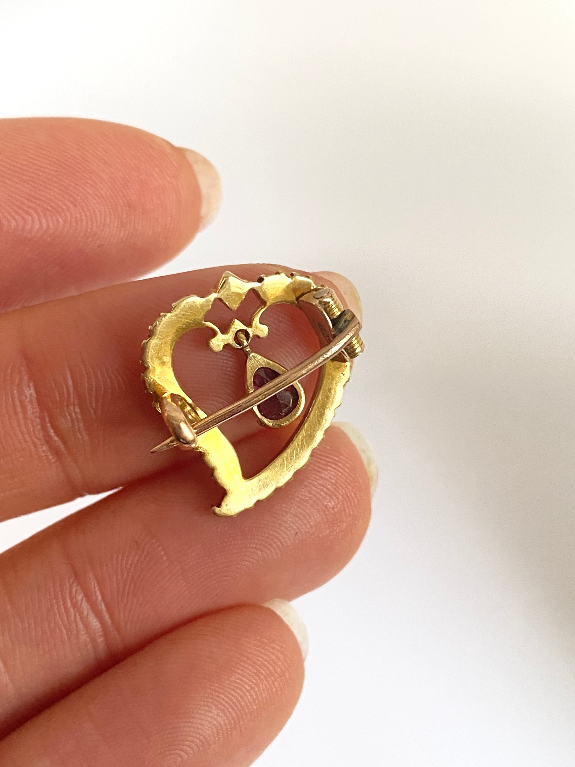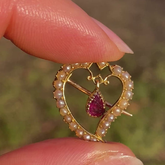 Romantic, Antique 15ct Gold, Pearl and Garnet Witches Heart Brooch
