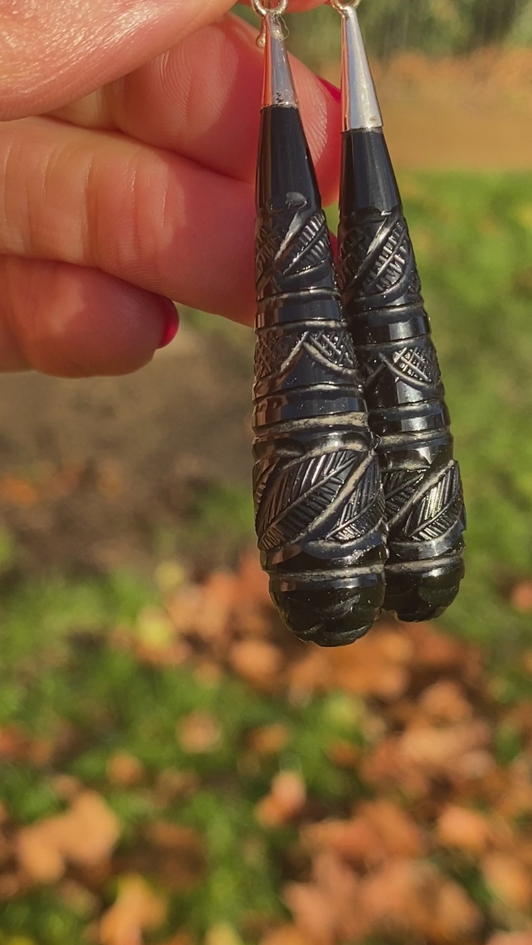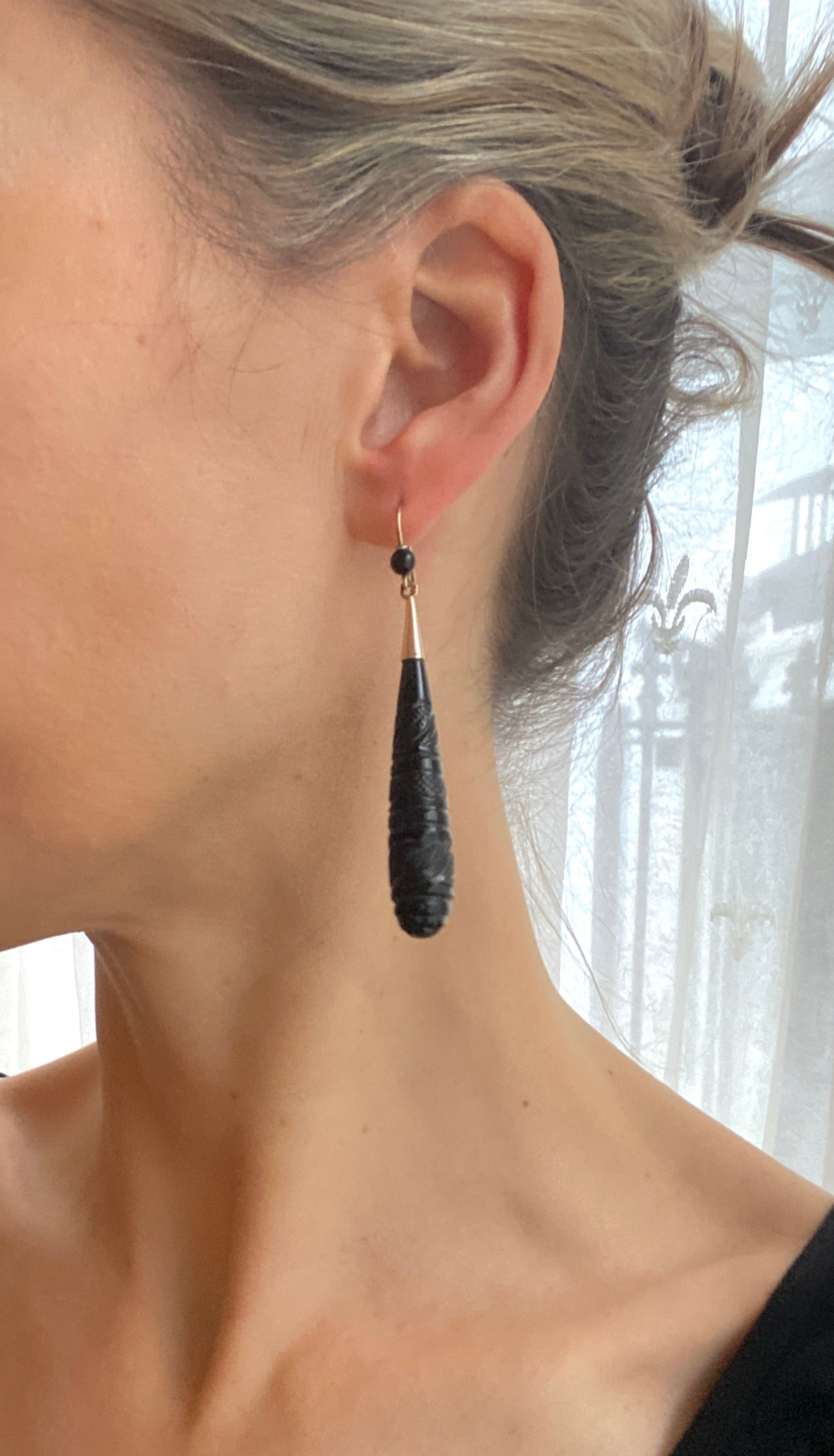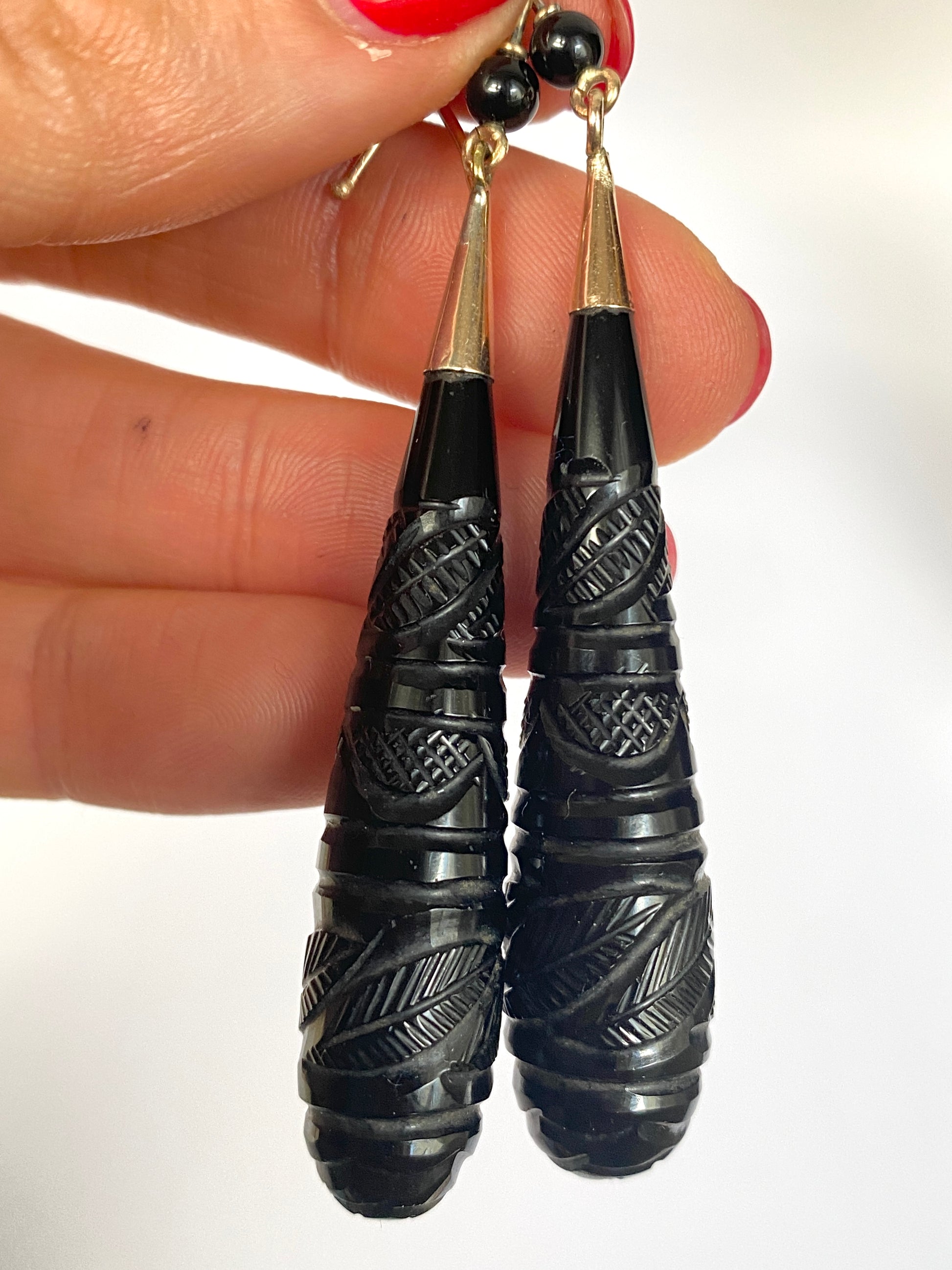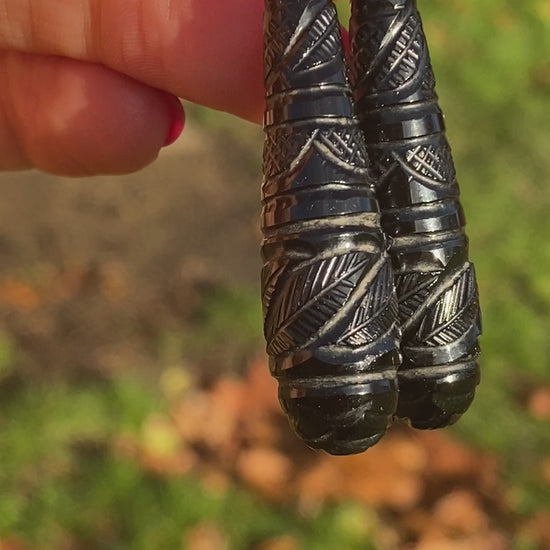 These stunning Victorian earrings are made of 9ct Gold and Whitby Jet. They feature incredible hand carved detail on the entirety of the jet and they measure 6cm x 1.2xm. They weigh 9.24g collectively.
