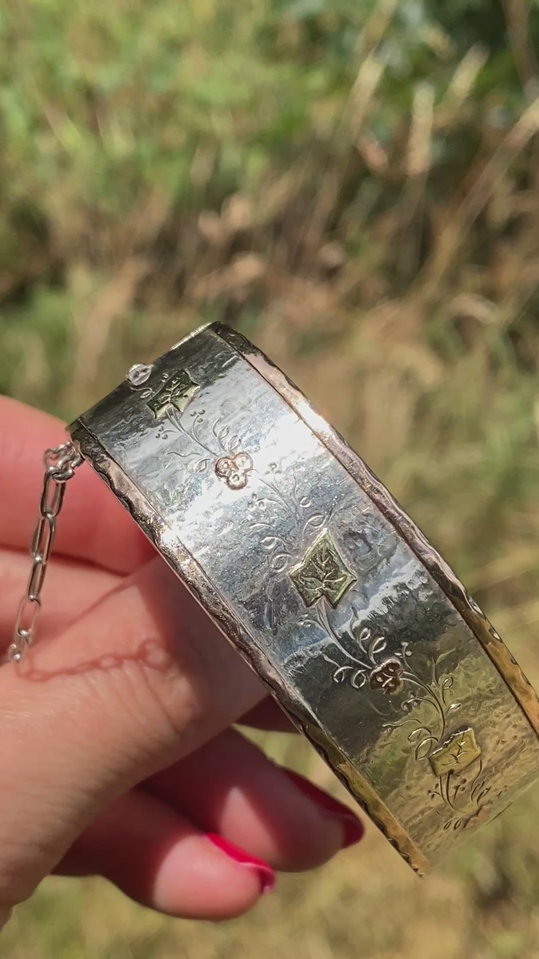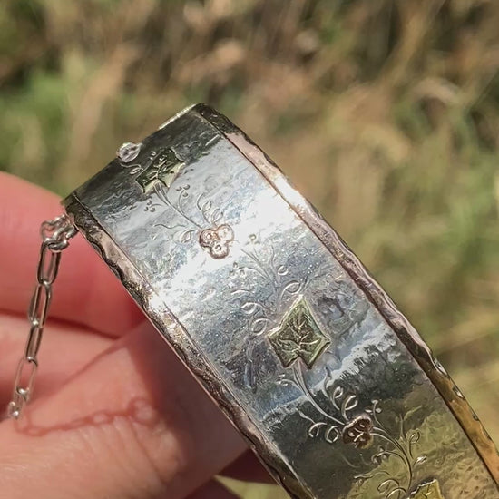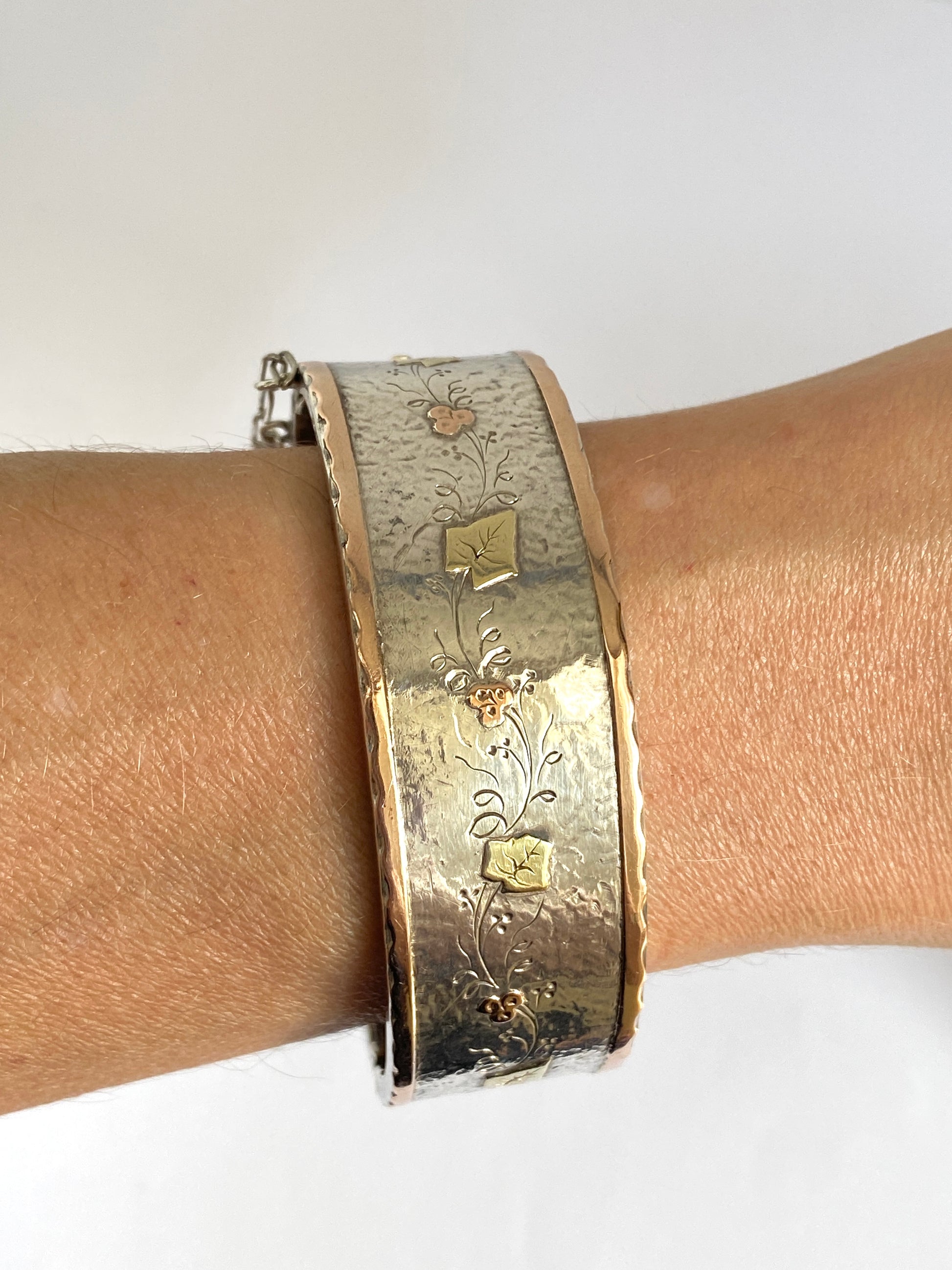 Crafted from Silver, this hinged cuff bangle represents luck and love! It features ivy leaves in yellow gold and three leaf clovers in rose gold, displayed along its front. Ivy leaves were jewelery speak for 'cling to thee', and represented forever love, and clovers represented luck to the wearer.
