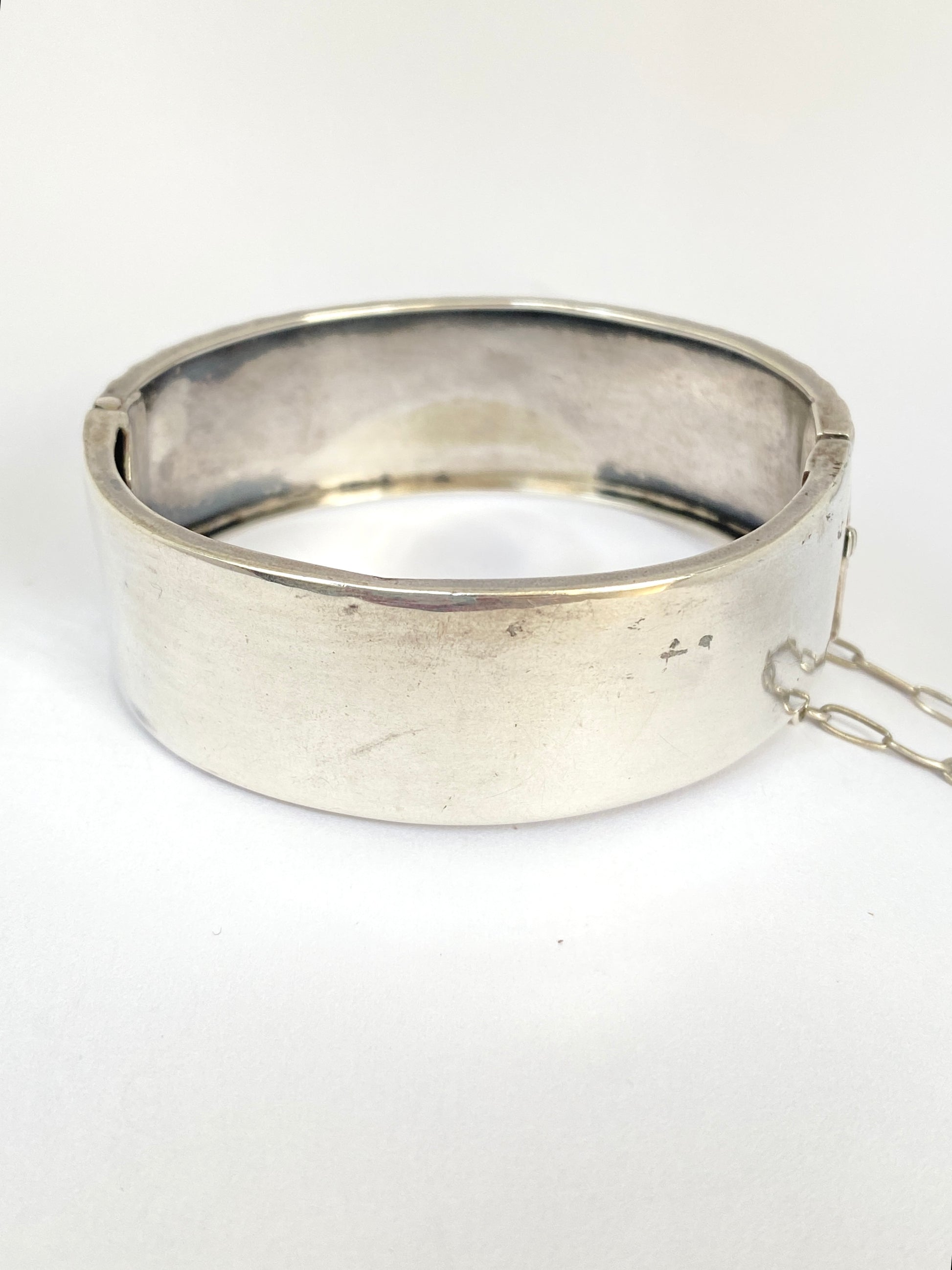 This bangle will fit a 6 - 6.5 inch wrist, and is approximately 2 cm wide all the way round. It has a firm clasp which clicks shut securely. It also comes with a safety chain, and weighs a very healthy 23g