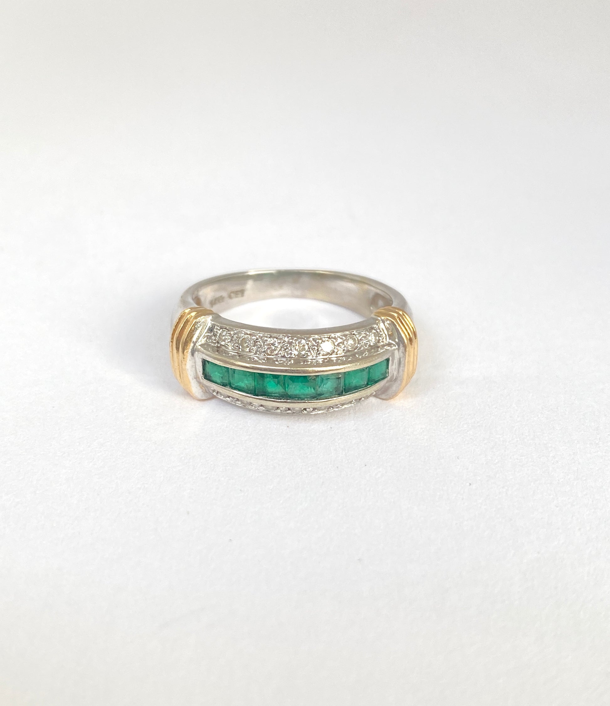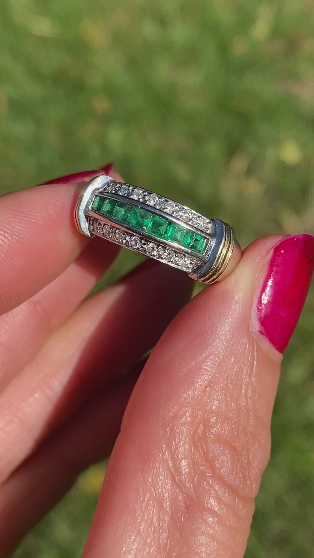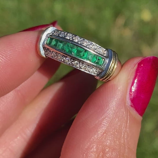This stunning vintage Emerald and Diamond Ring is comprised of 14ct Yellow and White Gold, and features 7 grass green channel set emeralds sandwiched between two rows of 7 claw set diamonds in a pretty and classical design.
