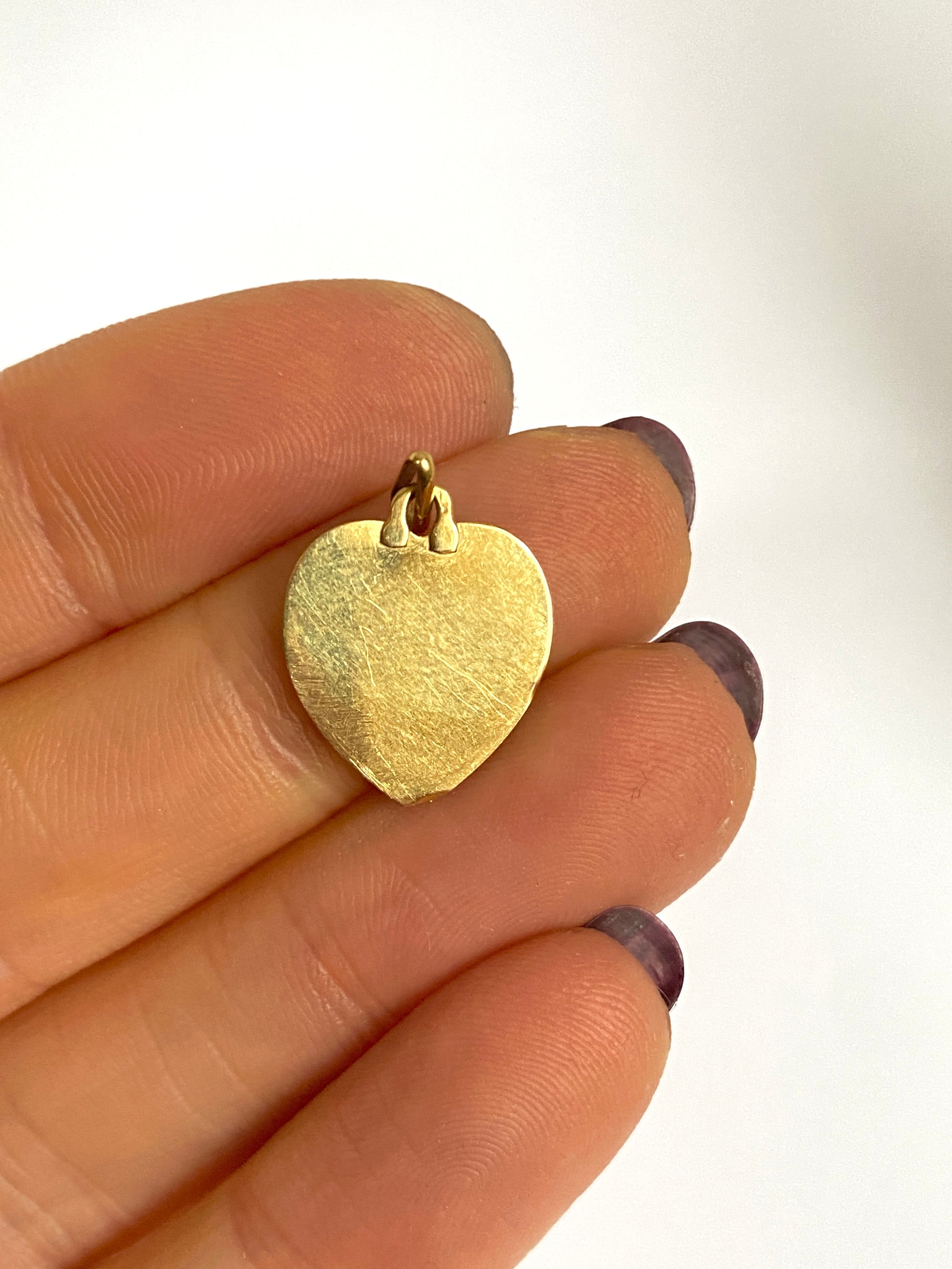 Original versions of this sweet pendant/charm are becoming extremely difficult to find and are extremely sought after. This one which is on a lovely rounded heart shape with smooth scalloped edges, features a white gold plus sign and two bright rubies in the minus sign. It measures 1.5cm by 1.5cm and weighs 1.12g of solid 18ct gold. The french bale displays a clear french hallmark for 18ct Gold, the eagle's head and it dates to around 1910.