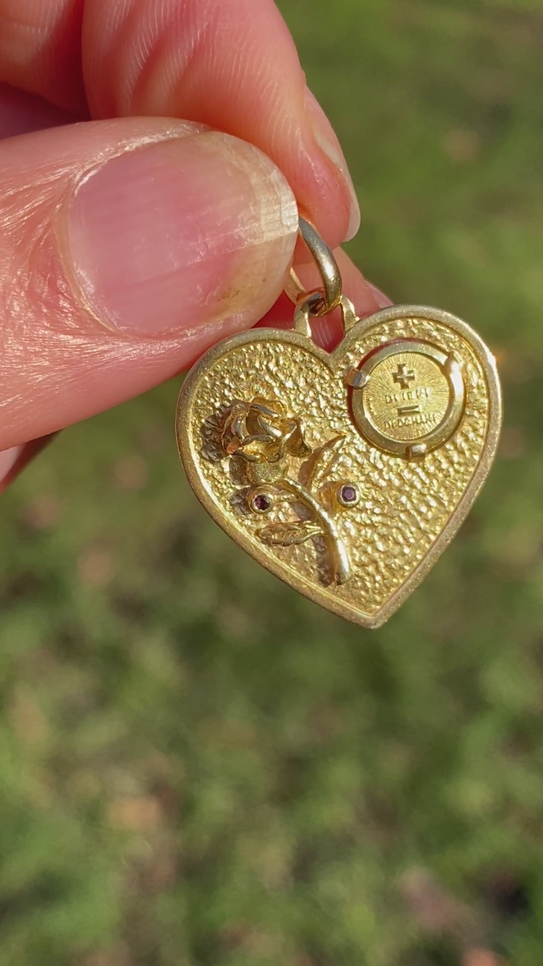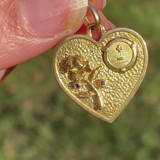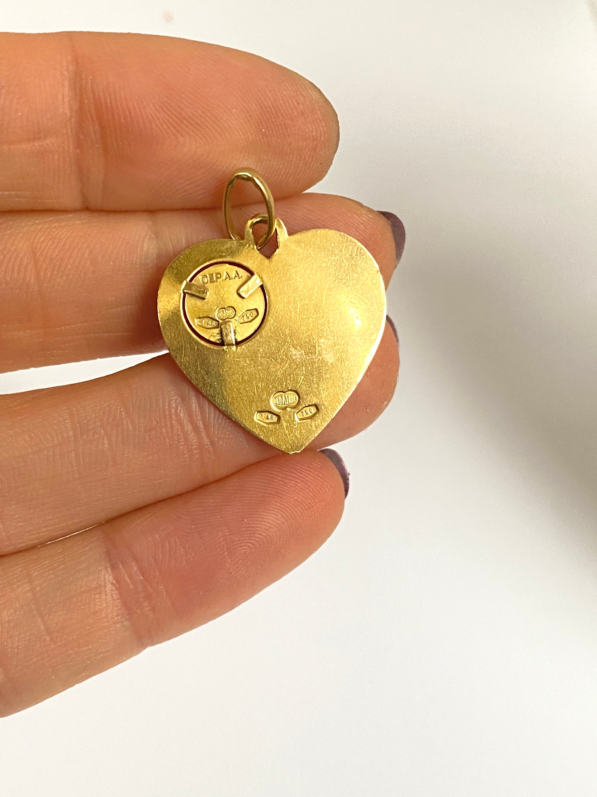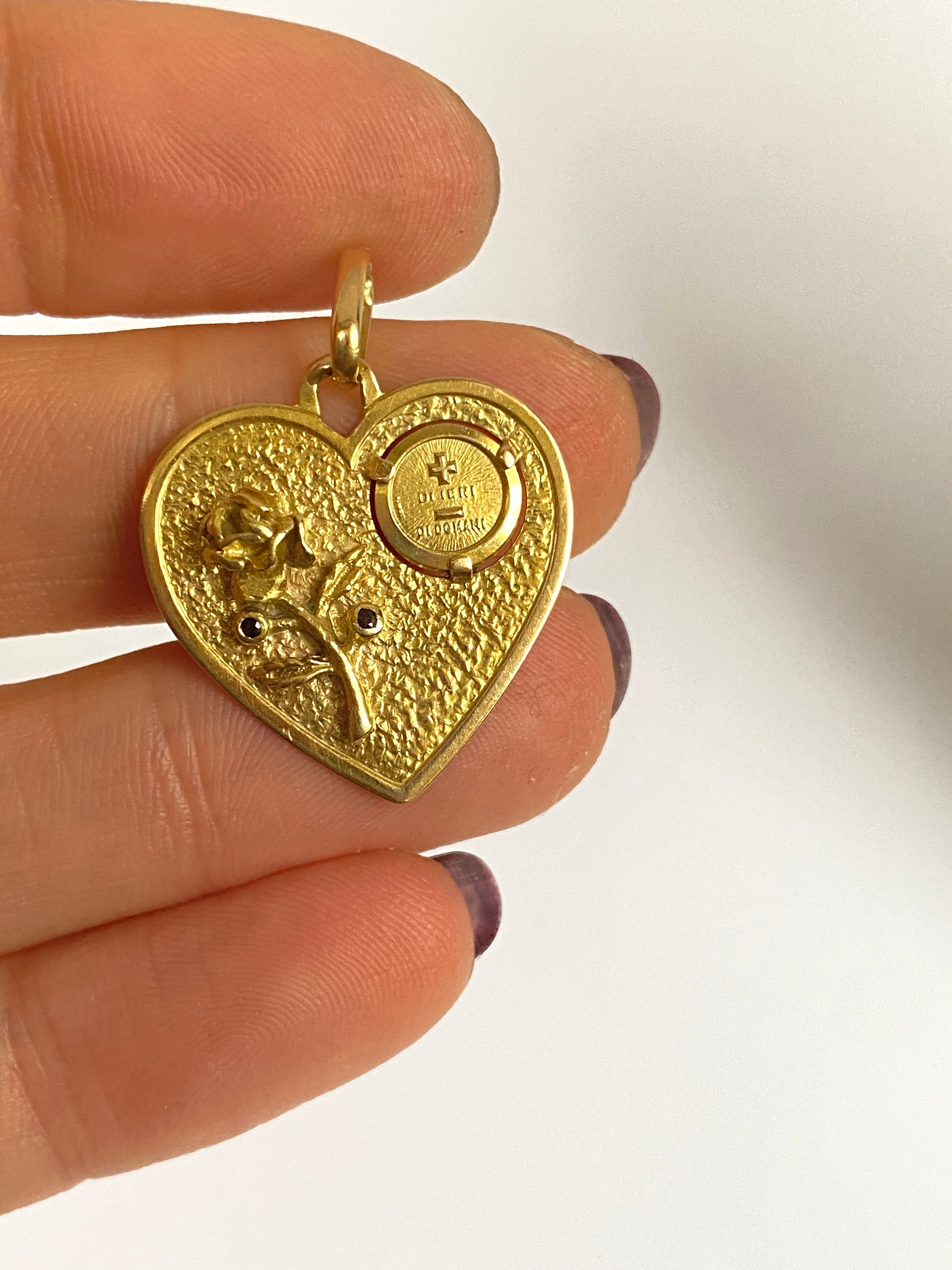 This vintage version is written in italian, with the words, 'di iere di domani' on a small medal within the heart's face. A beautiful rose is engraved on the left hand side, with two almandine garnets in place of petals. The reverse is plain with clear hallmarks for Italian designer, 'Unoaerre' and '750' for 18ct Gold