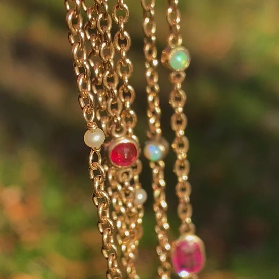 This fabulous 32 inch fancy link chain was a wonderful find. It features gem stations all around the chain, which include opals (double sided) almandine garnets, pearls and paste at intermittent intervals on a solid gold belcher chain. The necklace is made all the more unique by the fact the gems are differnet sizes and shapes.