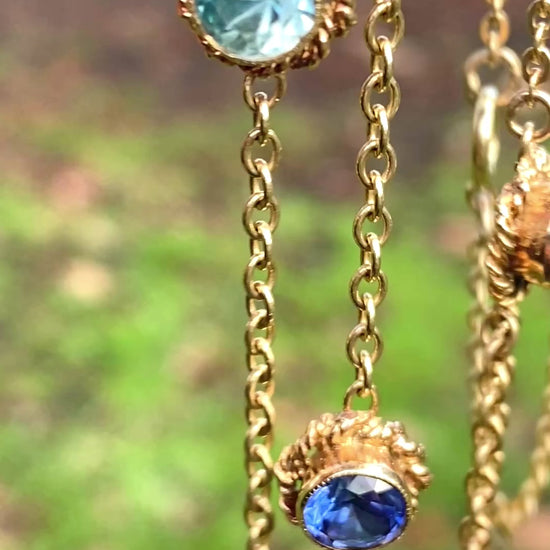 This very pretty 21.5 inch double row necklace features bezel set paste and semi precious stones all along the chain.  These bright and colourful stones include blue spinel, crystal, topaz, sapphire, tourmaline and citrine.
