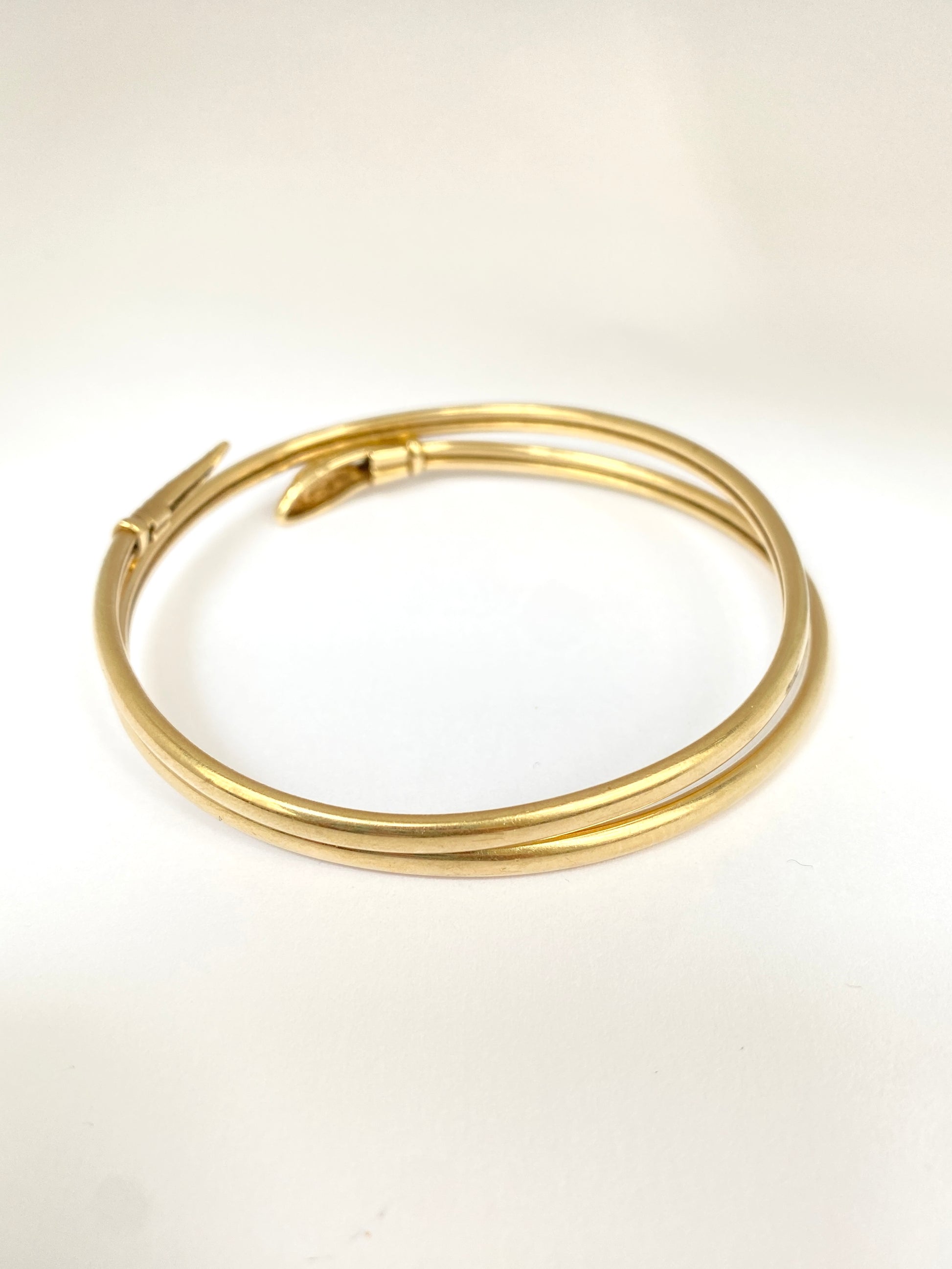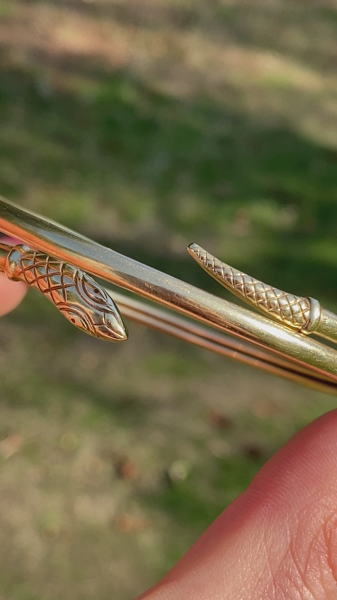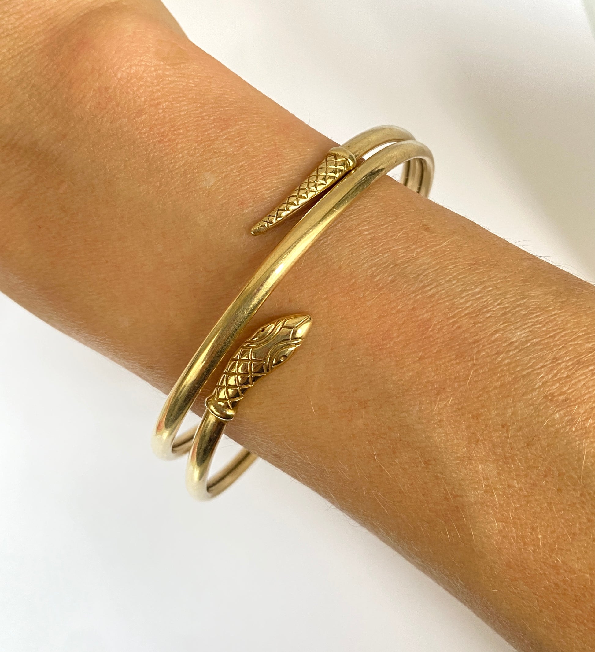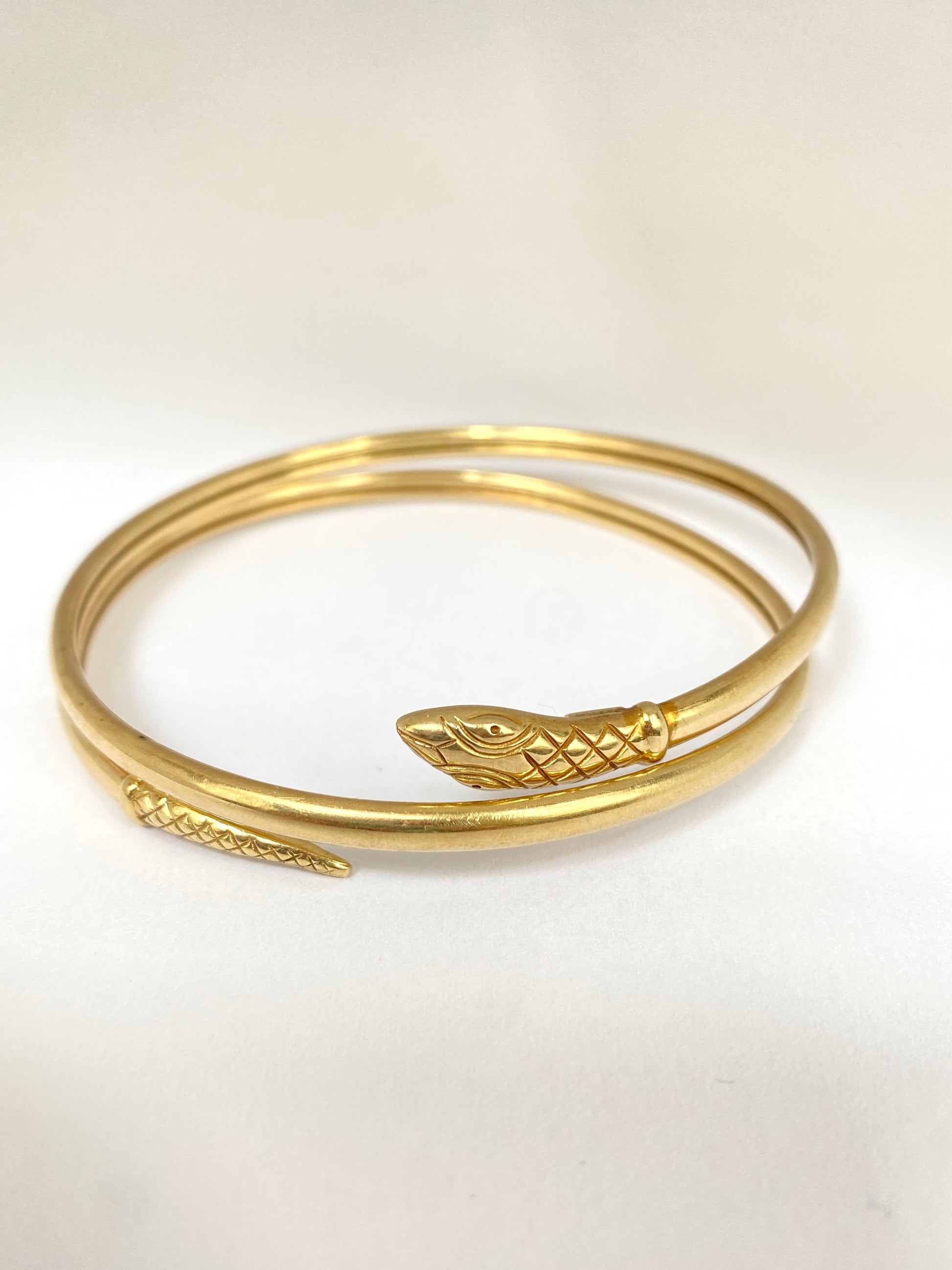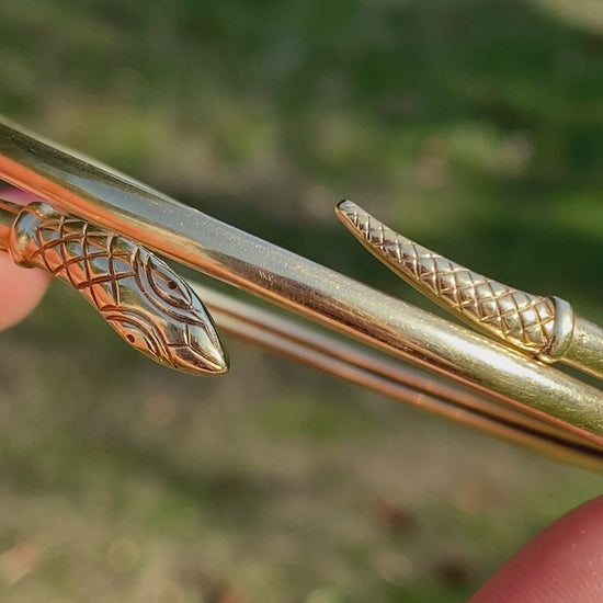 This fabulous 9ct gold snake bangle is a real find! It features an extendable coiled snake with gorgeous snake skin detail texture on the head and tale. The bangle opens up (the tail and head can be pulled away from each other) and so it has good flexibility to get on over the hand.