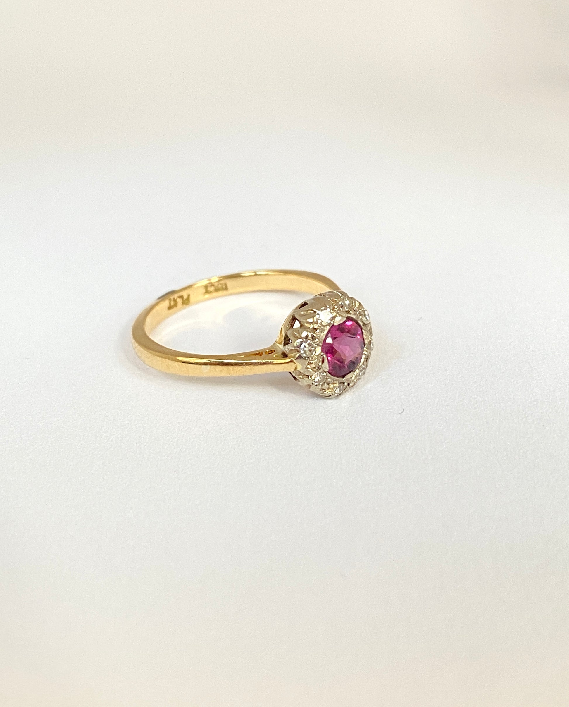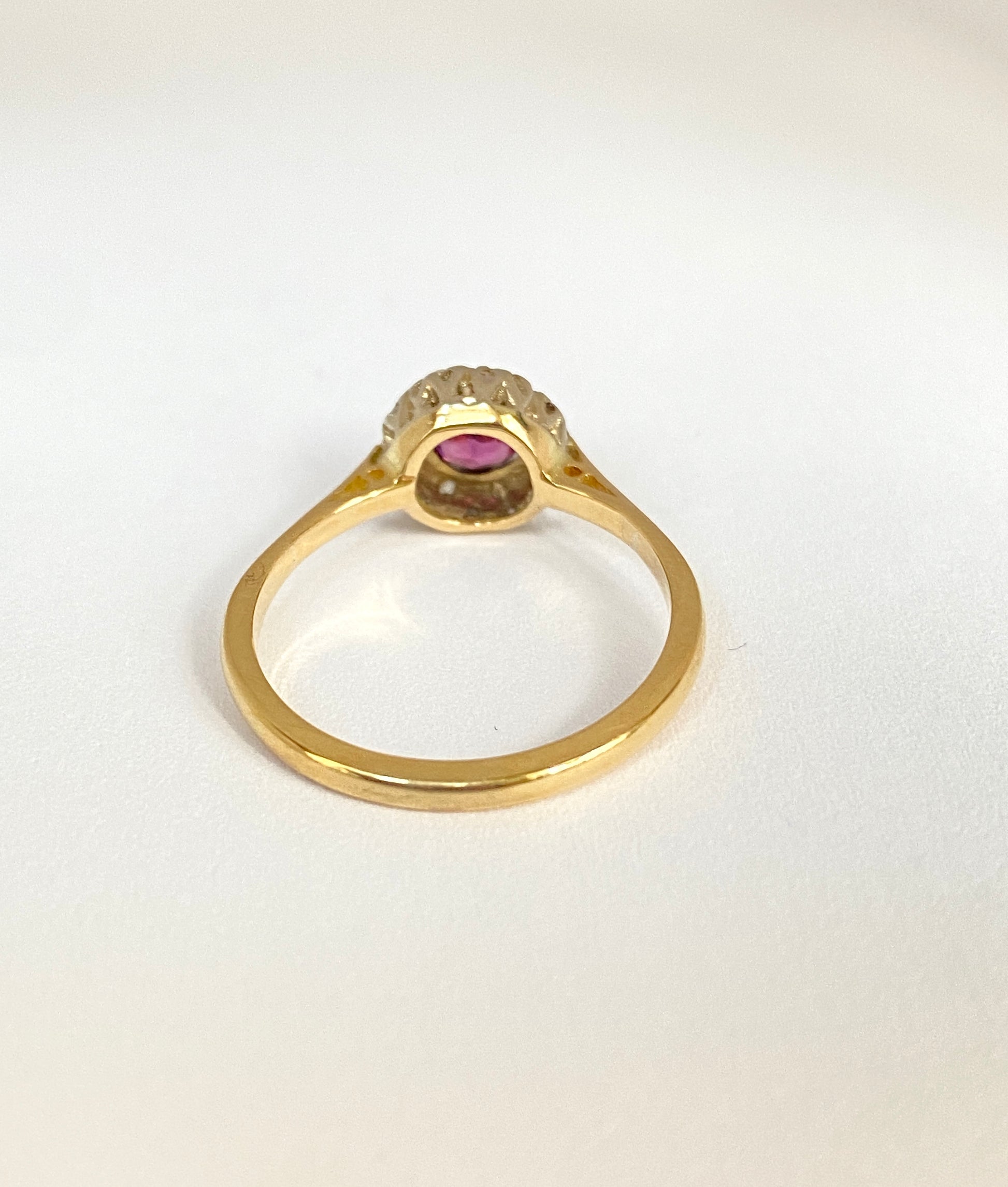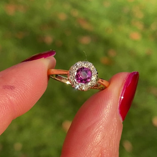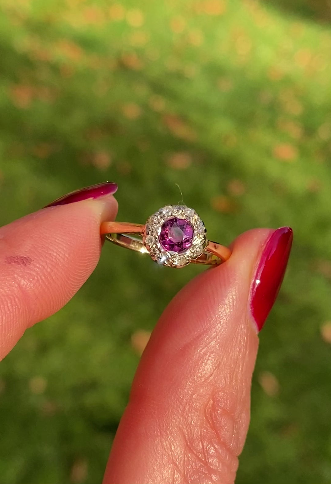 Set on an 18ct yellow gold band with a raised platinum gallery, this exceptional ring features a stunning pinky.purple almandine garnet amongst a halo of 8 diamonds in a slighly hexagonal design, It is hallmarked for 18ct Gold and Platinum and i would date it to the Art Deco era.