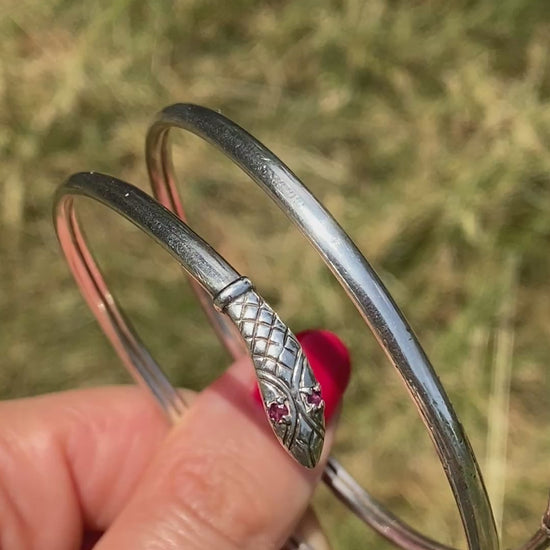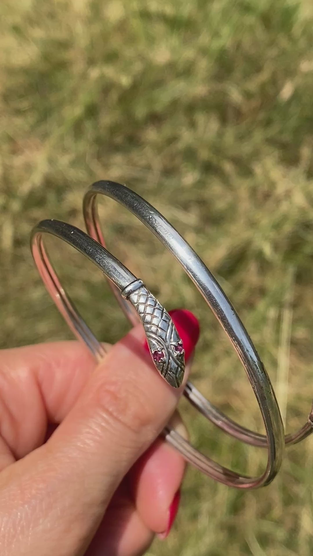 This fabulous ruby eyed snake bangle was such an exciting find! Crafted in Sterling Silver, it features a coiled snake with wonderful ruby red eyes. Its face and tail include some lovey snake skin texture. The bangle opens up (the tail and head can be pulled away from each other) and so it has good flexibility to get on over the hand.